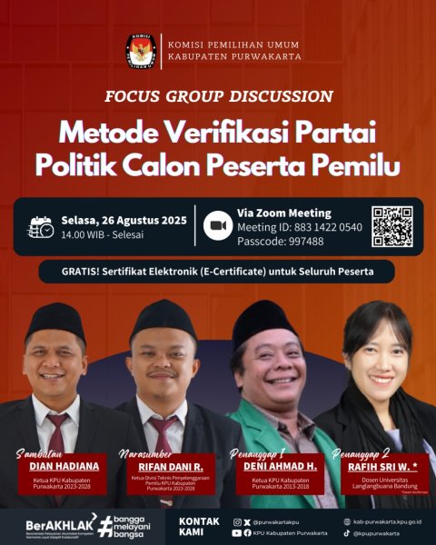 Dengan hormat, Komisi Pemilihan Umum (KPU) Kabupaten Purwakarta mengundang Bapak/Ibu/Saudara/i untuk mengikuti kegiatan Focus Gorup Discussion "Metode Verifikasi Partai Politik Calon Peserta Pemilu" yang akan diselenggarakan pada: