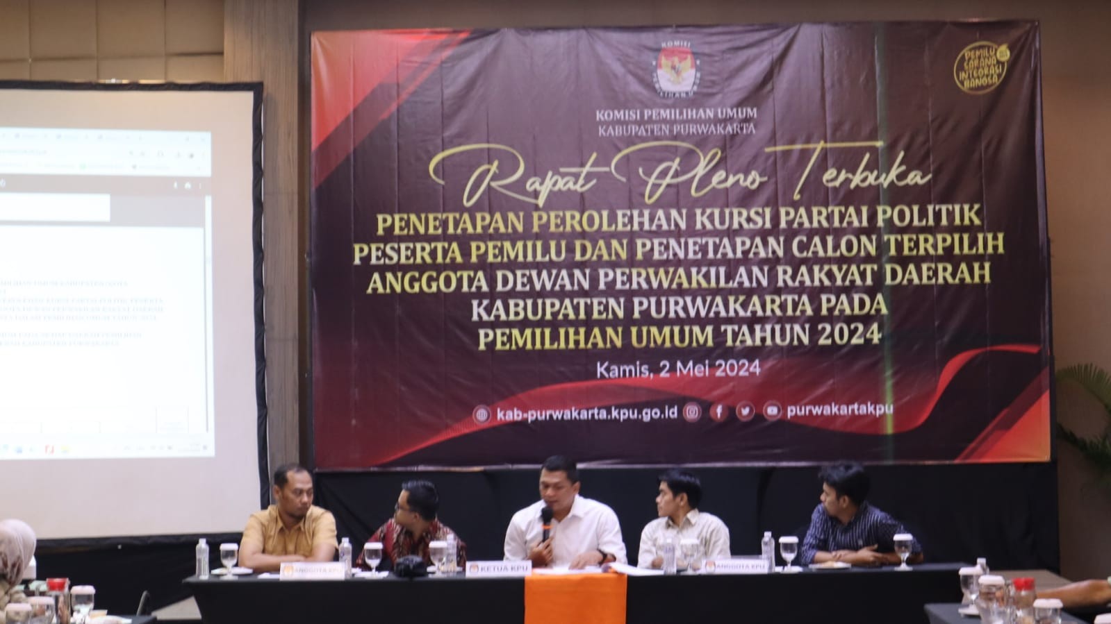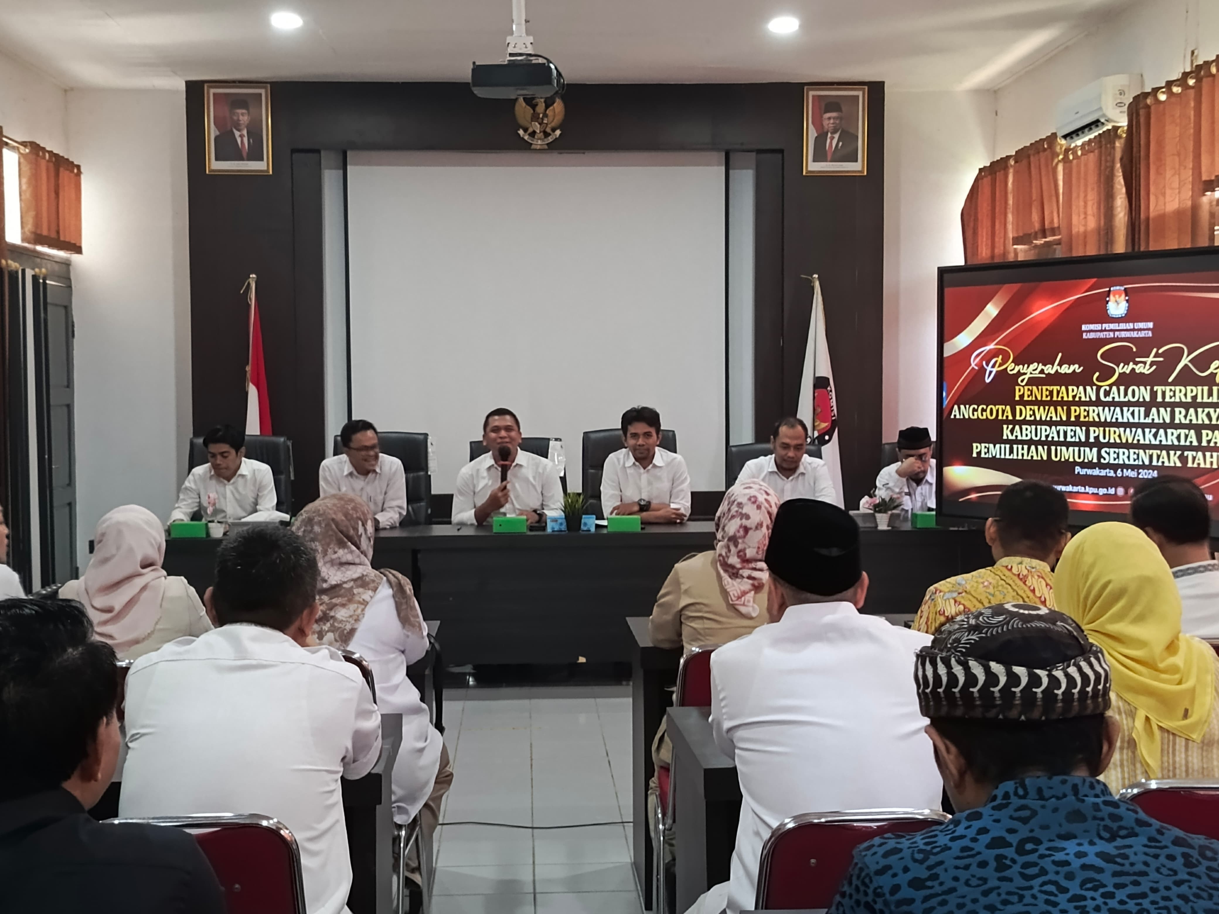 PURWAKARTA, kab-purwakarta.kpu.go.id – Komisi Pemilihan Umum (KPU) Kabupaten Purwakarta, Dian Hadiana, membuka acara penyerahan SK penetapan calon terpilih Anggota DPRD Kabupaten Purwakarta di Aula Kantor KPU Kabupaten Purwakarta, Senin, (6/5/2024). Kegiatan didasari dengan undangan Ketua KPU nomor 294/PL.01.9- Und/3214/2024 yang dihadiri oleh seluruh Komisioner serta Sekretaris KPU Kabupaten Purwakarta, Anggota Bawaslu Kabupaten Purwakarta, Perwakilan Pengurus Partai Politik tingkat Kabupaten Purwakarta serta Calon Terpilih Anggota DPRD Kabupaten Purwakarta pada Pemilu tahun 2024. Berdasarkan Lampiran Keputusan KPU Kabupaten Purwakarta Nomor 686 Tahun 2024, berikut daftar calon terpilih Anggota Dewan Perwakilan Rakyat Daerah Kabupaten Purwakarta dalam Pemilihan Umum tahun 2024: Dapil 1: 1. RICKY SYAMSUL FAUZI 4.936 suara (Gerindra) 2. DEDI JUHARI 6.610 suara (PKS) 3. LUTHFI BAMALA 8.215 suara (NasDem) 4. ALAIKASSALAM, S.H.I. 3.662 suara (PKB) 5. MESAKH SUPRIADI, S.E. 4.421 suara (Golkar) 6. WARSENO, S.E. 2.871 suara (PDIP) 7. DULNASIR, S.H., M.H. 2.589 suara (Demokrat) 8. TEDDY NANDUNG HERYAWAN, S.E. 3.775 suara (Gerindra) 9. YANTHI NURHAYATI, S.Pd. 3.775 suara (PPP) Dapil 2 1. AHMAD SANUSI, S.M. 11.348 suara (Golkar) 2. Drs. H. ENTIS SUTISNA, S.H., M.M 5.392 suara (PDIP) 3. SRI PUJI UTAMI 6.353 suara (Gerindra) 4. Dra. Hj. DENI YANTHI 4.413 suara (NasDem) 5. H. MOH. ARIEF KURNIAWAN, M.M. 4.493 suara (PKS) 6. H. AGUS WIJAYA, S.H. 2.492 suara (Demokrat) 7. KARWITA, S.H., M.H. 2.643 suara (Golkar) 8. INA HERLINA 5.252 suara (PDIP) 9. REGINA MULYA DWIYANTI 3.681 suara (PDIP) 10. H. ELTHON BRAMEISTA GUNAWAN, S.H. 3.800 suara (NasDem) Dapil 3 1. SAID ALI AZMI 4.596 suara (Gerindra) 2. HILMI SIROJUL FUADI 5.245 suara (PKB) 3. KAMAL, S.S. 3.746 suara (Golkar) 4. IIN SALAMIRAH 3.746 suara (NasDem) 5. DIDIN HENDRAWAN, S.E. 1.909 suara (PKS) 6. MUHSIN JUNAEDI 4.134 suara (HANURA) 7. LINA YULIANI 3.011 suara (PDIP) 8. SULAEMAN 2.941 suara (Gerindra) Dapil 4 1. H. OJA SUTISNA 8.556 suara (Golkar) 2. ZUSYEF GUSNAWAN, S.E 4.055 suara (Gerindra) 3. ZAENAL ARIFIN 3.965 suara (PKB) 4. UJANG ROSADI 4.141 suara (PDIP) 5. Hj. ENAH ROHANAH 3.935 suara (Golkar) 6. DENISA WULANDARI, S.M. 5.489 suara (NasDem) Dapil 5 1. CECENG ABDUL QODIR, S.Pd.I. 6.495 suara (PKB) 2. DIAS RUKMANA PRAJA, S.E. 4.328 suara (Golkar) 3. WAWAN SETIAWAN, S.E. 4.047 suara (Gerindra) 4. DEVI MUTIARA SARI 2.756 suara (NasDem) 5. ATO RUKMANA 2.453 suara (PPP) 6. NOVITA PURWANTI 2.690 suara (PDIP) 7. H. ASEP NURYANI, S.Pd.I. 2.752 suara (PKS) 8. AGUS MAHARDIKA 2.008 suara (PKB) 9. H. ELAN SOFIYAN, S.M. 3.056 (Golkar) Dapil 6 - Hj. NINA HELTINA 5.981 suara (Gerindra) - ASTRI NOVITASARI 5.012 suara (NasDem) - H. AMING, S.M. 5.480 suara (PAN) - DIANA LISU ARRANG BATO LIMBONG, S.Pd. 5.690 suara (Gerindra) - DEDI SUTARDI 2.768 suara (PKS) - Hj. PUTRIARTI PUTIK HARUMAWANGI, S.E. 5.149 suara (Golkar) - ASEP CHANDRA TK 5.648 suara (Demokrat) - ASEP ABDULOH 4.638 suara (HANURA) Kegiatan ditutup dengan penyerahan Salinan Surat Keputusan KPU Kabupaten Purwakarta Nomor 686 Tahun 2024 tentang Penetapan Calon Terpilih Anggota DPRD Kabupaten Purwakarta dalam Pemilu Tahun 2024 kepada calon terpilih. (Humas KPU Purwakarta: PPdrio)