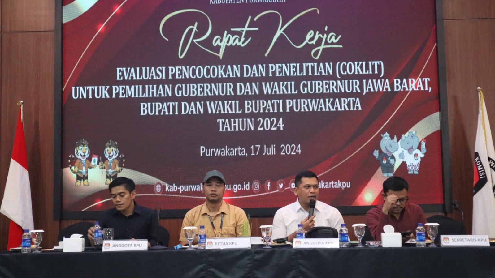 Purwakarta -- KPU Kabupaten Purwakarta melaksanakan Rapat Kerja Evaluasi Pencocokan dan Penelitian (Coklit) Untuk Pilkada 2024, di Ballroom Jatiluhur Valley Resort, Rabu 17 Juli 2024.