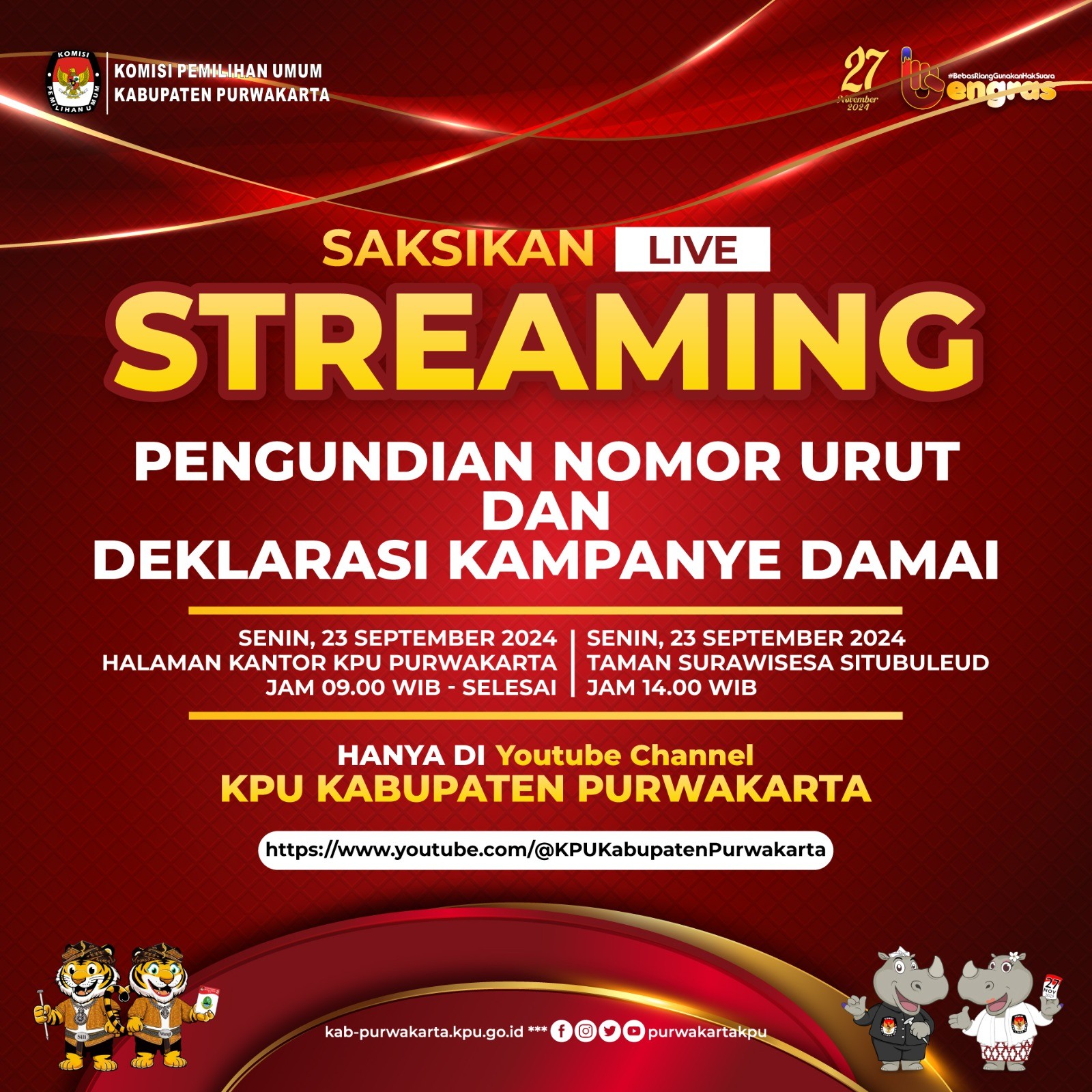 Pengundian nomor urut lokasinya di Halaman Kantor KPU Purwakarta sekira pukul 09.00 WIB. Sementara deklarasi damai di Taman Surawisesa Situ Buleud pukul 14.00 WIB. "Kedua agenda itu akan ditayangkan live di kanal Youtube KPU Purwakarta," ujar dia.