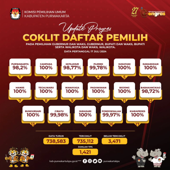 #TemanPemilih berikut update Coklit Daftar Pemilih pada Pemilihan Gubernur dan Wakil Gubernur Jawa Barat, Bupati dan Wakil Bupati Purwakarta tahun 2024, Data pertanggal 19 Juli 2024.