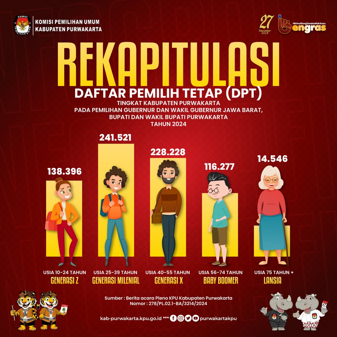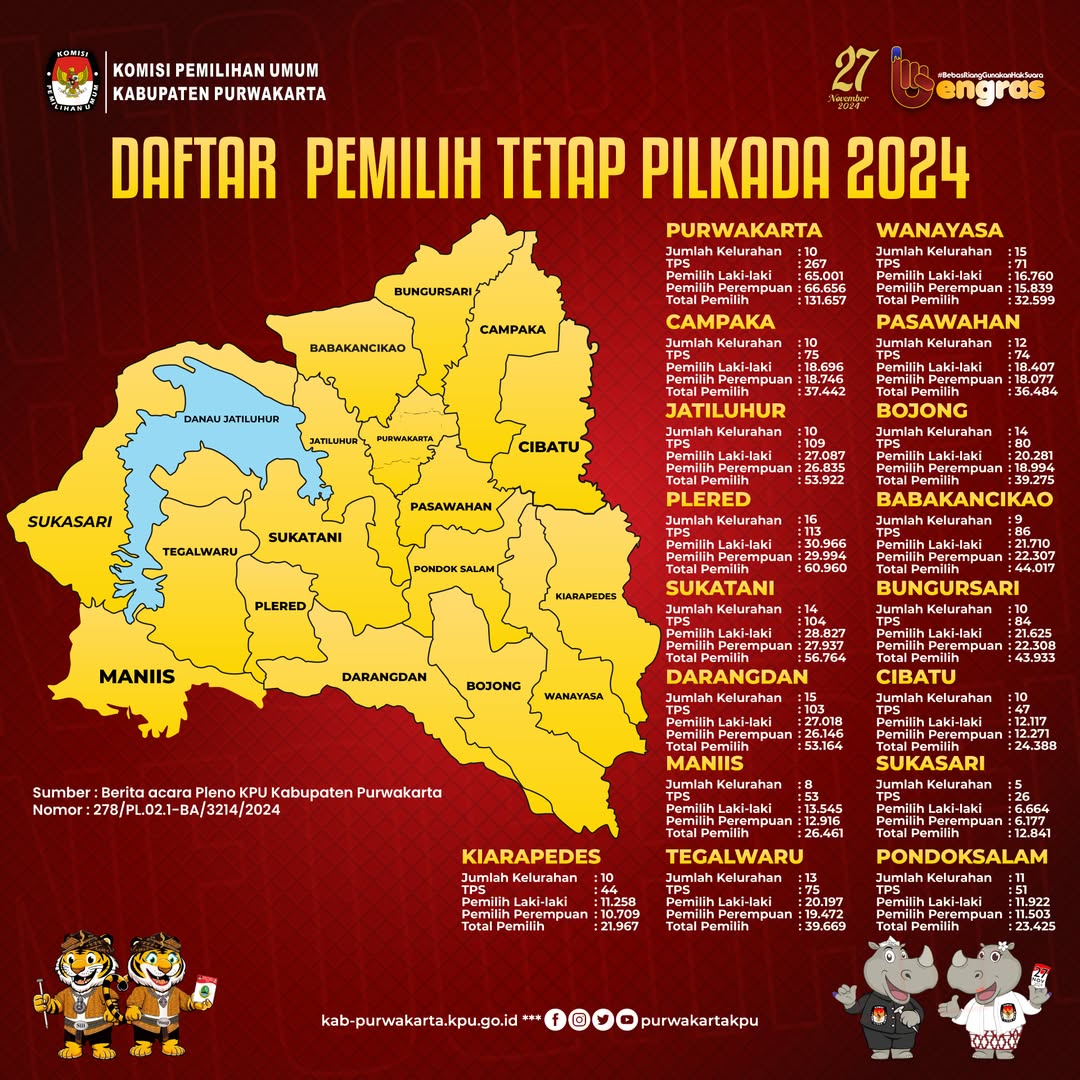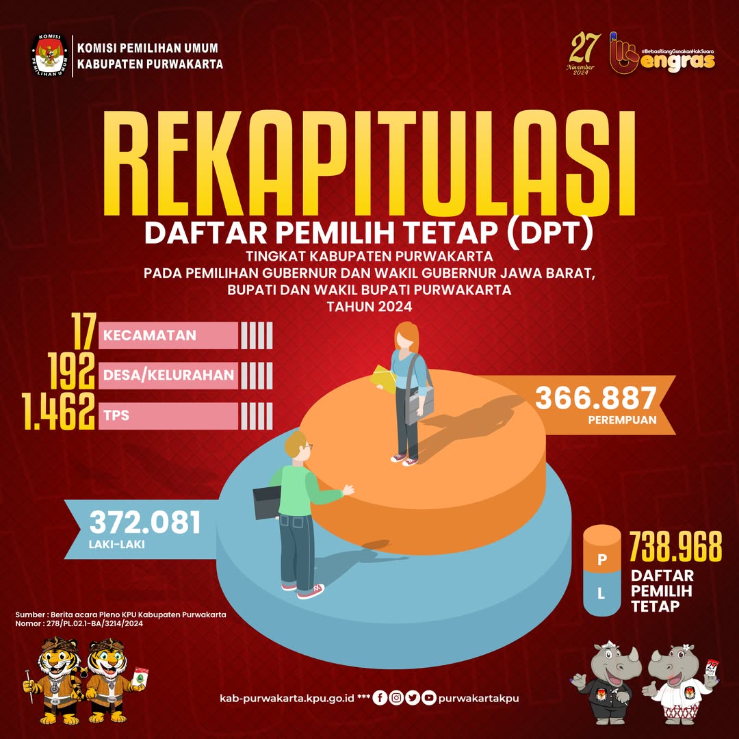 #TemanPemilih Infografis Daftar Pemilih Tetap (DPT) Tingkat Kabupaten Purwakarta pada pemilihan Gubernur dan Wakil Gubernur Jawa Barat serta Bupati dan Wakil Bupati Purwakarta Tahun 2024.