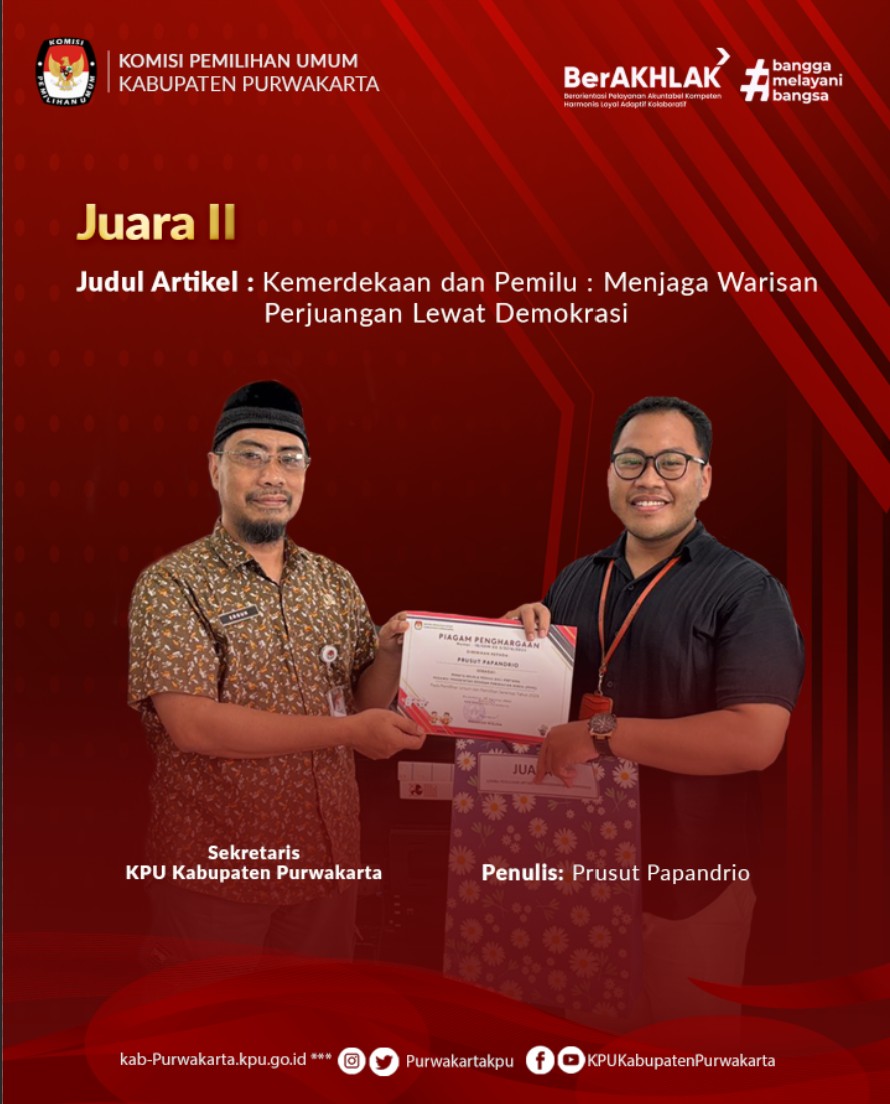 Dalam rangka memperingati HUT ke-80 Kemerdekaan Republik Indonesia, KPU Kabupaten Purwakarta menyelenggarakan Lomba Penulisan Artikel dengan tema “Kemerdekaan dan Demokrasi”. Kegiatan ini diikuti oleh seluruh pegawai KPU Kabupaten Purwakarta sebagai bentuk refleksi dan kontribusi dalam mengisi kemerdekaan melalui karya tulis.