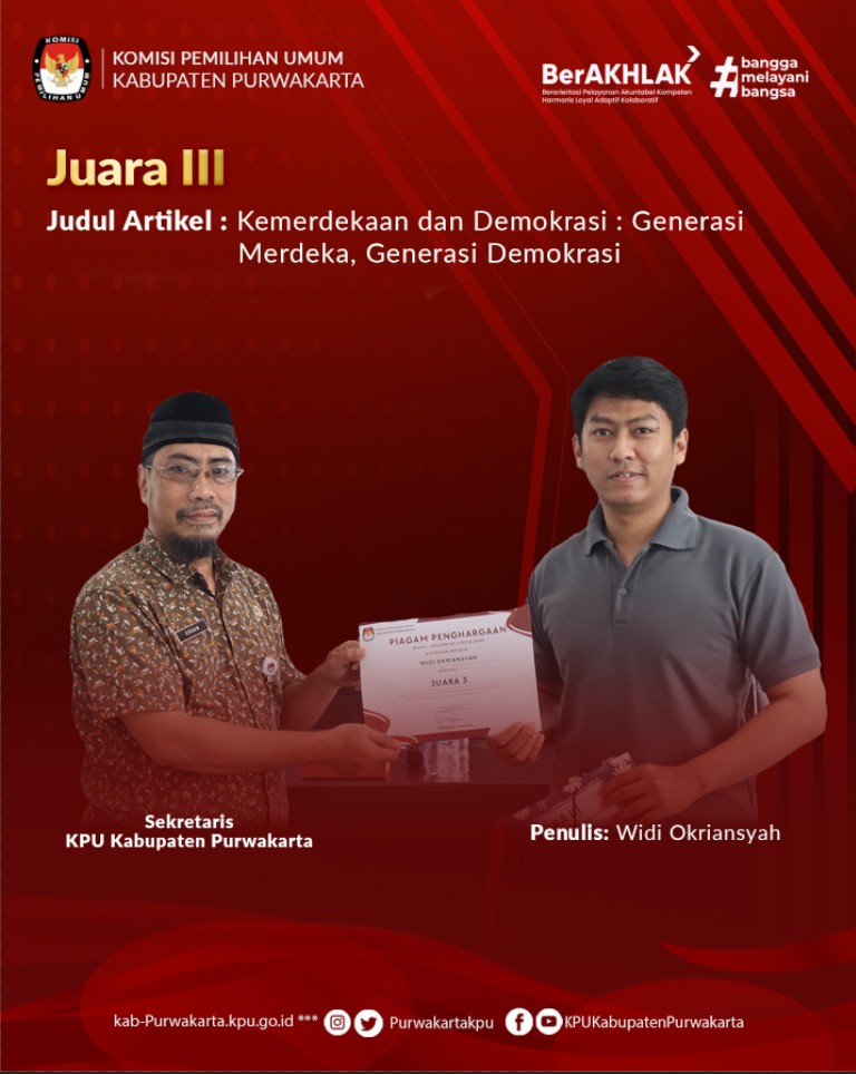 Adapun artikel dari seluruh peserta dapat secara lengkap di Website KPU Kabupaten Purwakarta pada tautan sebagai berikut: