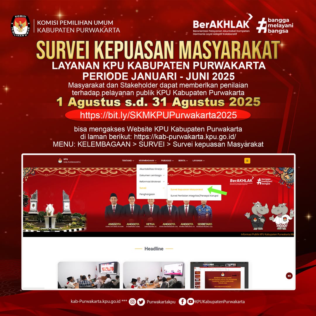 https://bit.ly/SKMKPUPurwakarta2025 dan Kunjungi Website kami di laman, https://kab-purwakarta.kpu.go.id/ untuk menu survei kepuasan masyarakat, MENU: KELEMBAGAAN > SURVEI > Survei Kepuasan Masyarakat
