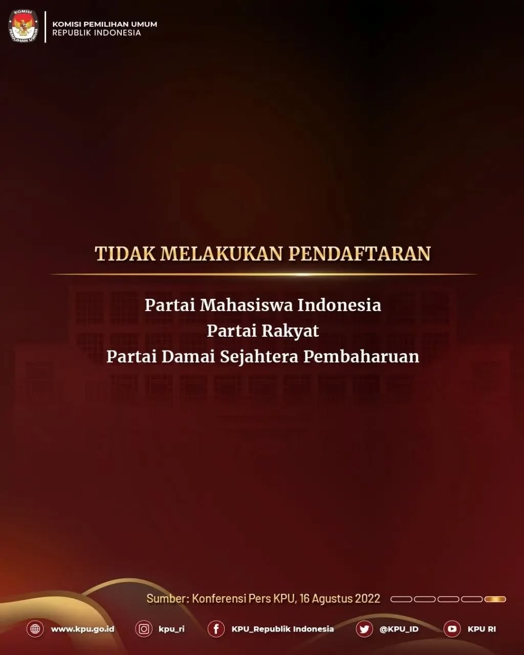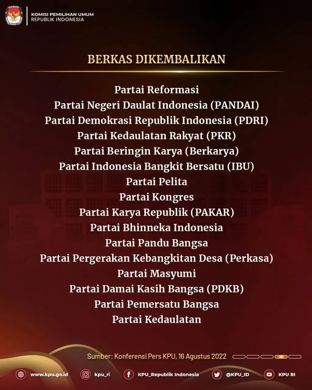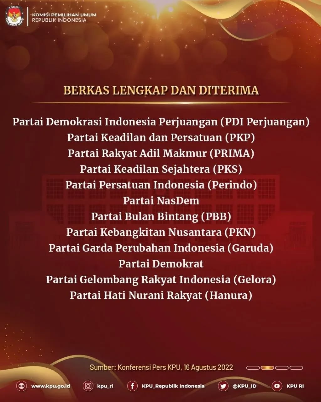 #TemanPemilih, kamu perlu tahu, inilah 24 partai politik yang berkas pendaftarannya sudah lengkap sebagai calon Peserta Pemilu 2024 dan 16 partai politik yang berkas pendaftarannya dikembalikan serta 3 partai politik yang tidak melakukan pendaftaran,