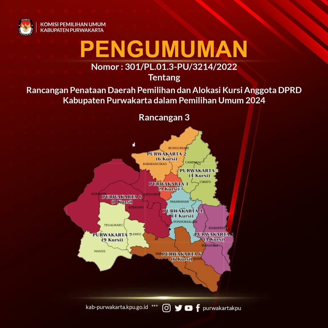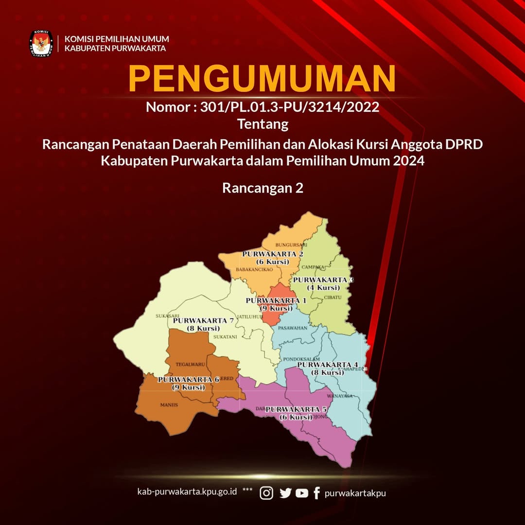 #TemanPemilih, berikut Pengumuman Rancangan Penataan Daerah Pemilihan dan Alokasi Kursi Anggota DPRD Kabupaten Purwakarta dalam Pemilihan Umum 2024.