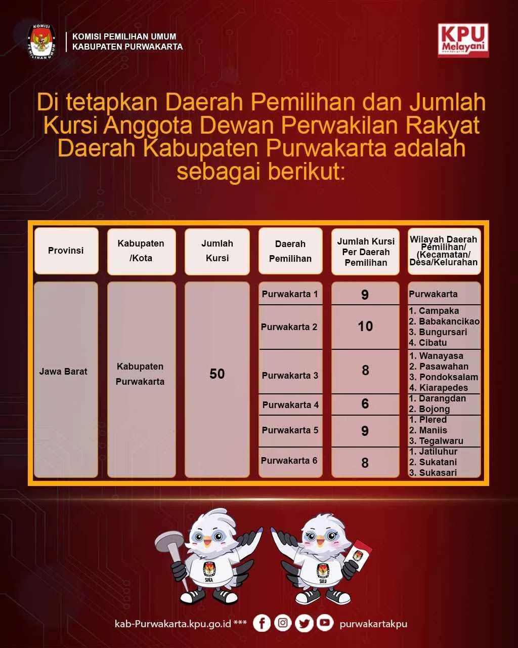 Di tetapkan Daerah Pemilihan dan Jumlah Kursi Anggota Dewan Perwakilan Rakyat Daerah Kabupaten Purwakarta sebagai berikut: