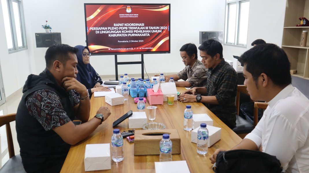 KPU Kabupaten Purwakarta menyelenggarakan Rapat Koordinasi Persiapan Pleno Pemutakhiran Data Pemilih (PDPB) Triwulan III Tahun 2025 pada Kamis, 2 Oktober 2025, bertempat di Ruang Rapat KPU Kabupaten Purwakarta. Dihadiri oleh Ketua Divisi Perencanaan, Data dan Informasi, Iip Saripudin dan Ketua Divisi Hukum dan Pengawasan, Syahrul Awaludin, Kasubbag Perencanaan, Data dan Informasi, Gitasari dan staf Sekretariat KPU Kabupaten Purwakarta serta mengundang pihak eksternal diantaranya perwakilan dari Bawaslu, Disdukcapil dan DPMD Kabupaten Purwakarta.