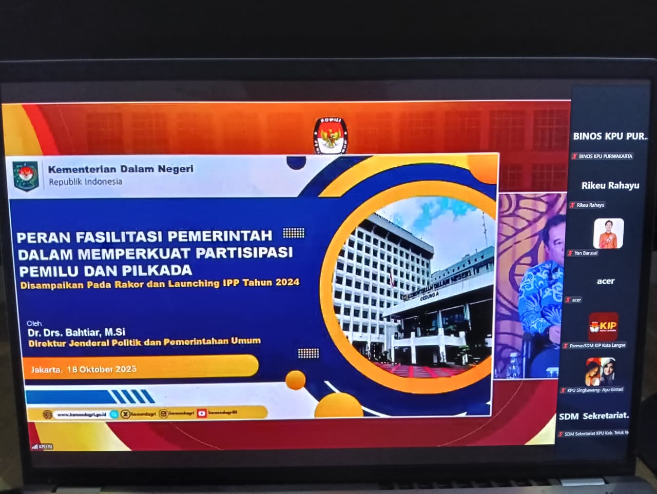 Purwakarta — Komisi Pemilihan Umum (KPU) Kabupaten Purwakarta berpartisipasi secara daring dalam Rapat Koordinasi Divisi Sosialisasi, Pendidikan Pemilih, dan Partisipasi Masyarakat Tahun 2025 serta Launching Indeks Partisipasi Pilkada (IPP) 2024 yang diselenggarakan KPU Republik Indonesia di Jakarta, Jumat–Sabtu (17–18/10). Kegiatan ini dihadiri oleh Ketua Divisi Sosdiklih, Parmas, dan SDM, Kepala Subbagian Parhumas dan SDM, serta pelaksana sekretariat KPU Kabupaten Purwakarta.