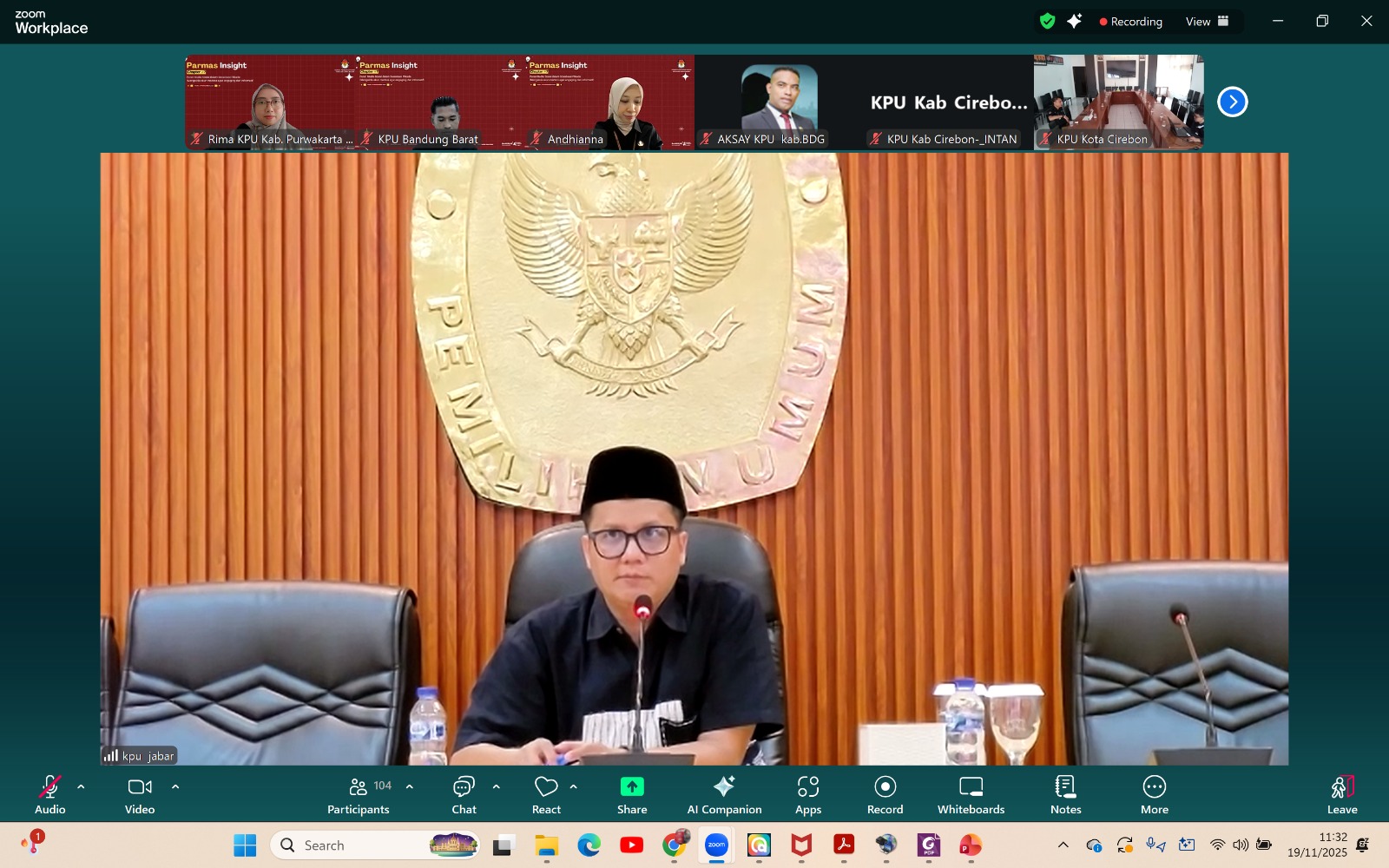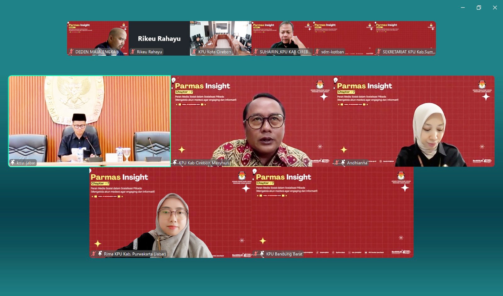 PURWAKARTA — Komisi Pemilihan Umum (KPU) Kabupaten Purwakarta kembali berpartisipasi aktif dalam kegiatan Parmas Insight Chapter #7 dengan tema “Peran Media Sosial dalam Sosialisasi Pilkada: Mengelola Akun Medsos agar Engaging dan Informatif” yang diselenggarakan oleh KPU Provinsi Jawa Barat secara daring melalui aplikasi Zoom Meeting pada Rabu (19/11). Kegiatan ini diikuti oleh KPU Provinsi serta KPU Kabupaten/Kota se-Jawa Barat sebagai bagian dari penguatan kapasitas kehumasan dan strategi komunikasi publik menjelang penyelenggaraan Pilkada.