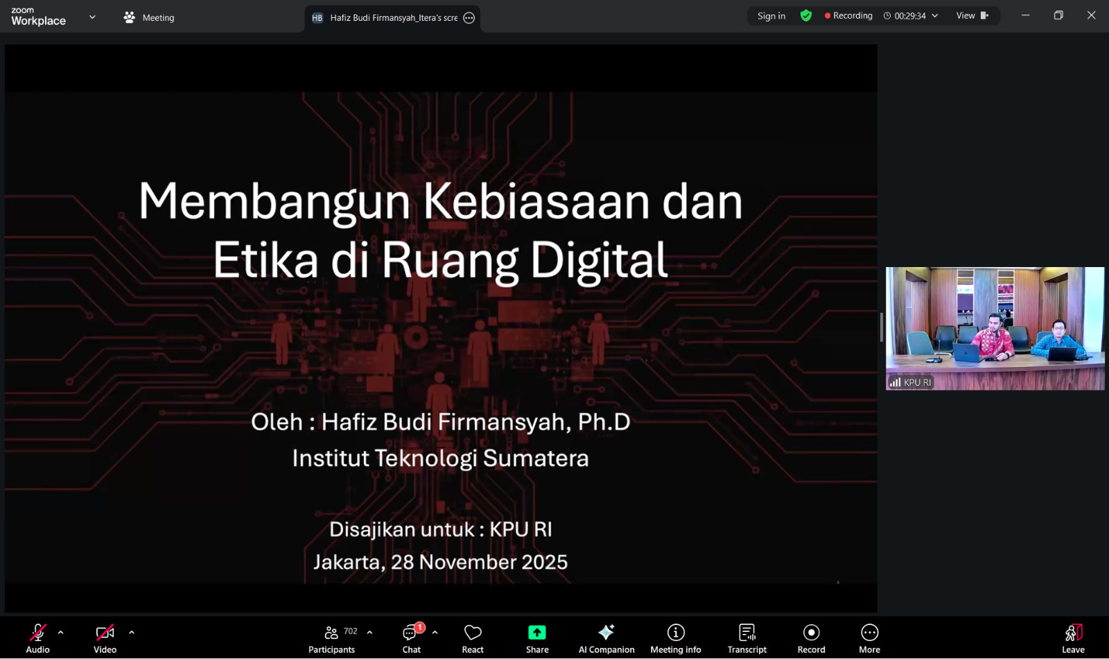 PURWAKARTA — Komisi Pemilihan Umum (KPU) Kabupaten Purwakarta mengikuti webinar bertema “Membangun Kebiasaan dan Etika di Ruang Digital” yang diselenggarakan pada Jumat (28/11) secara daring melalui Zoom Meeting. Kegiatan ini merupakan bagian dari upaya peningkatan kapasitas sumber daya manusia (SDM) KPU untuk menghadapi dinamika ruang digital yang semakin cepat, kompleks, dan penuh risiko.