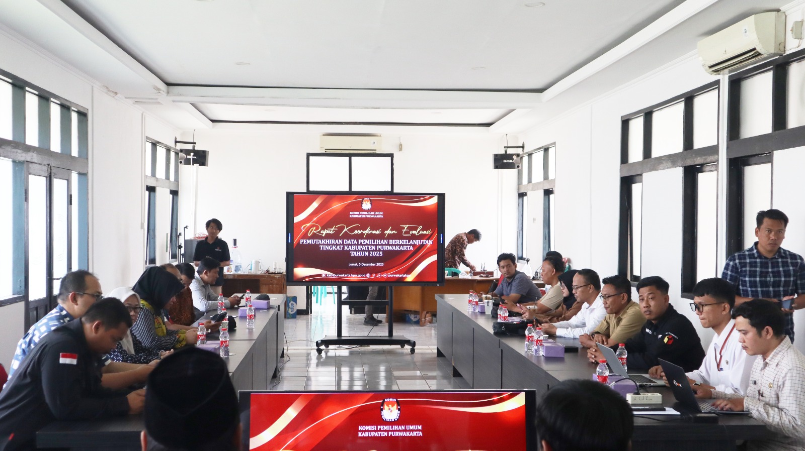 PURWAKARTA — Komisi Pemilihan Umum (KPU) Kabupaten Purwakarta menyelenggarakan Rapat Koordinasi dan Evaluasi Pemutakhiran Data Pemilih Berkelanjutan (PDPB) Tahun 2025 pada Jumat (5/12) di Aula KPU Kabupaten Purwakarta. Kegiatan ini dihadiri oleh Ketua dan Anggota KPU Purwakarta, jajaran Sekretariat. Turut hadir pemangku kepentingan lintas sektor, antara lain Bawaslu, Disdukcapil, Bakesbangpol, Polres, Kodim 0619, Lapas Kelas IIB, Kementerian Agama, DPMD, dan KCD Pendidikan Wilayah IV Jawa Barat.