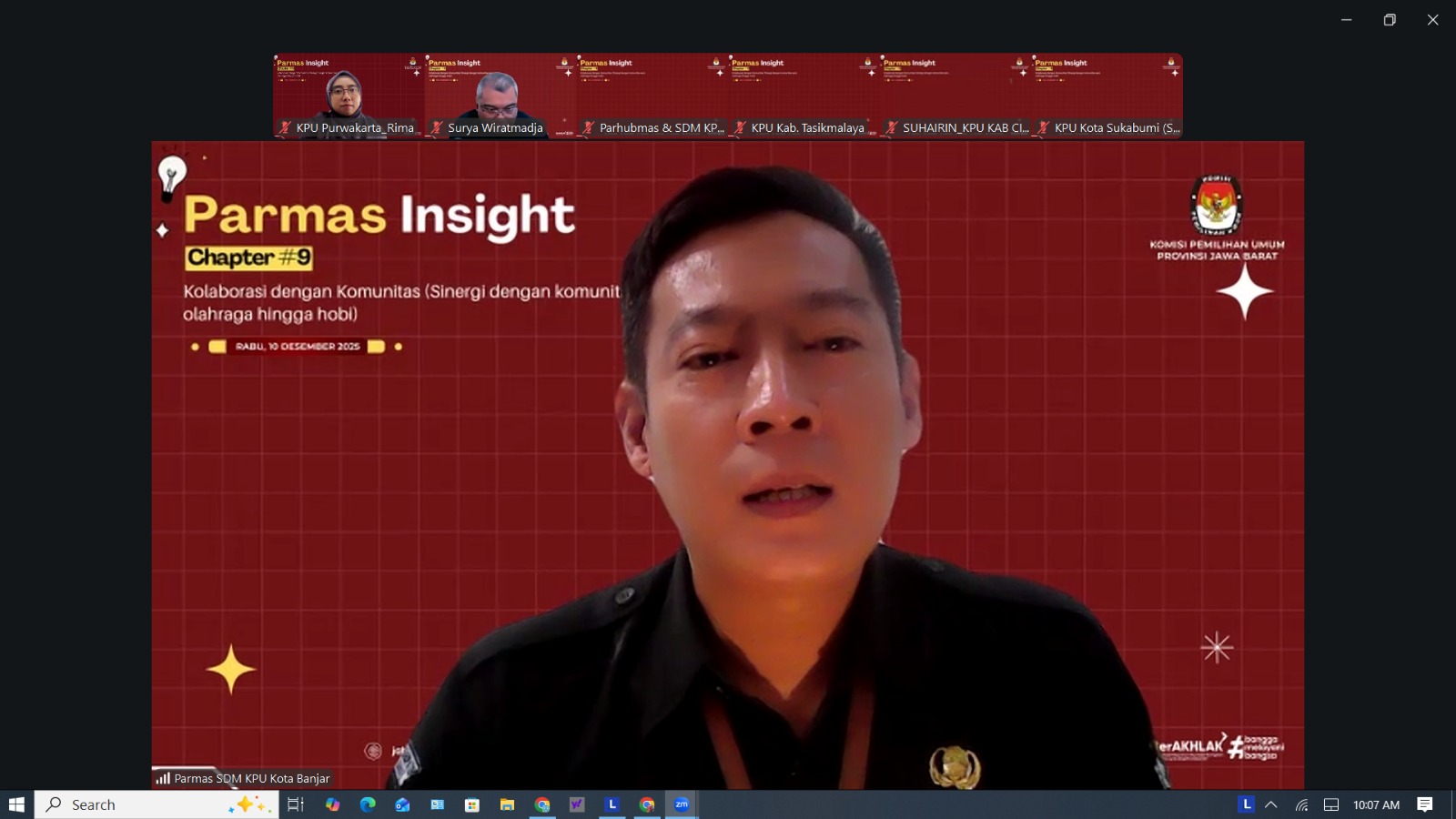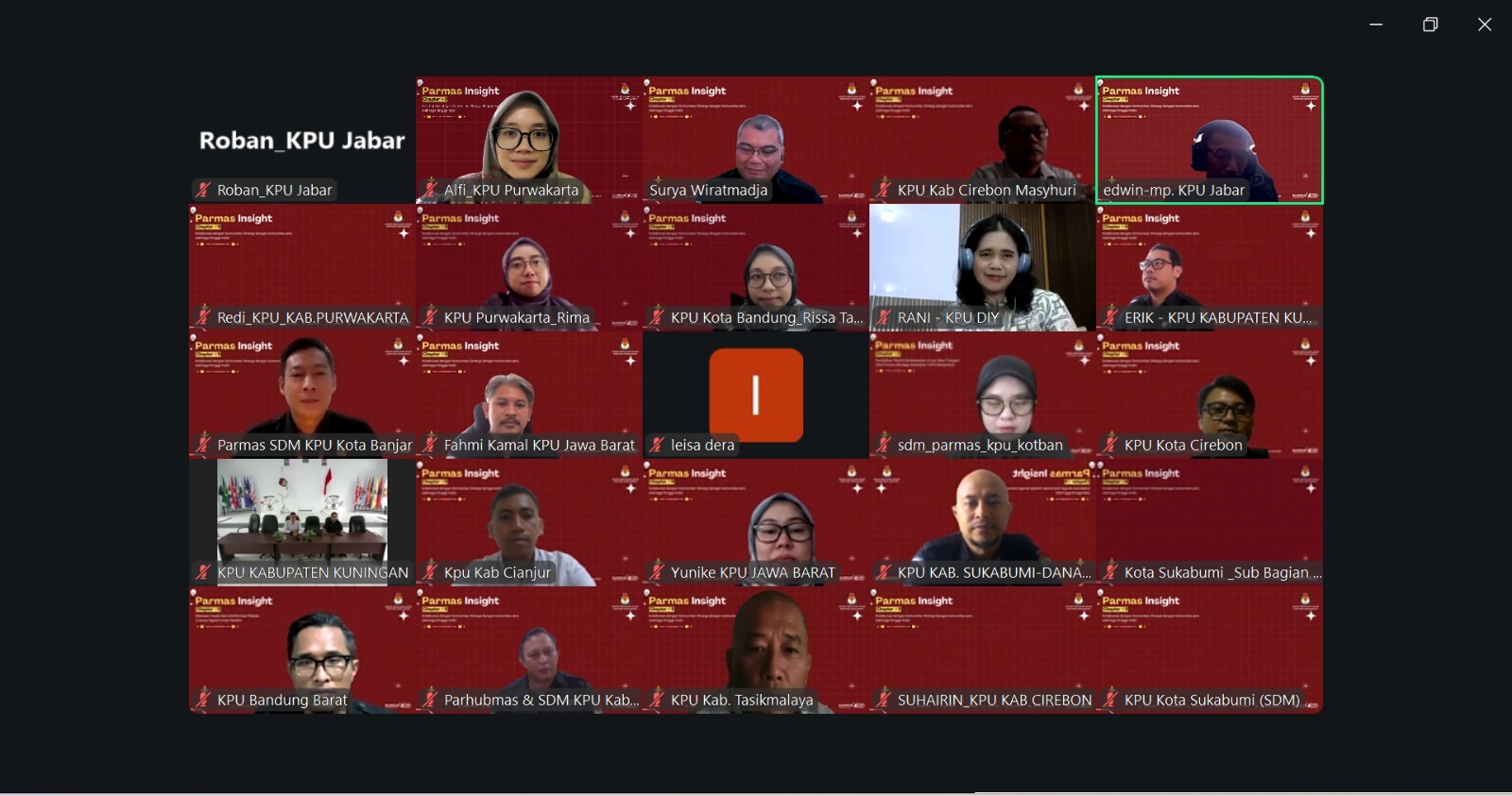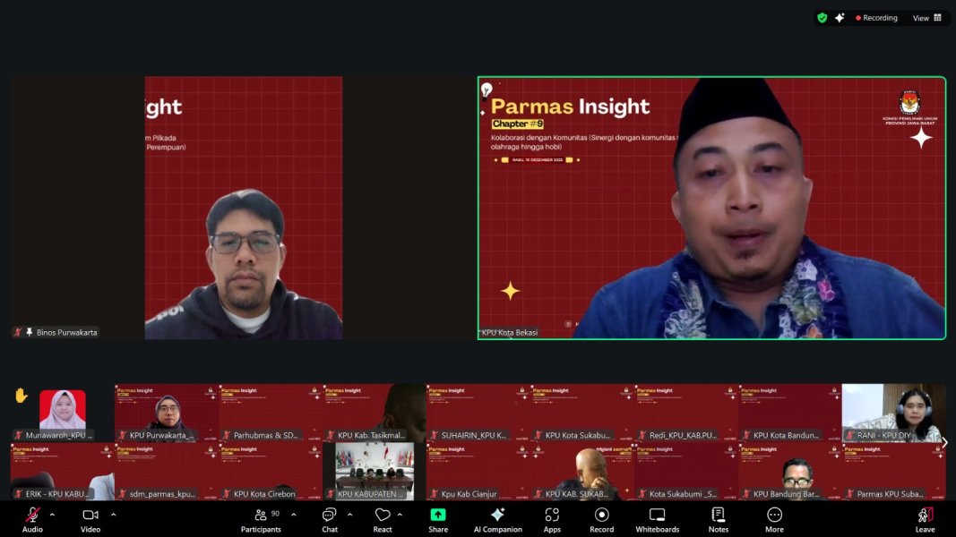 PURWAKARTA — Komisi Pemilihan Umum (KPU) Kabupaten Purwakarta mengikuti kegiatan Parmas Insight Chapter #9 dengan tema “Kolaborasi dengan Komunitas: Sinergi dengan Komunitas Seni, Olahraga hingga Hobi”, yang diselenggarakan oleh KPU Provinsi Jawa Barat secara daring melalui Zoom Meeting pada Rabu (10/12). Agenda ini menghadirkan KPU Provinsi dan KPU Kabupaten/Kota se-Jawa Barat sebagai peserta.