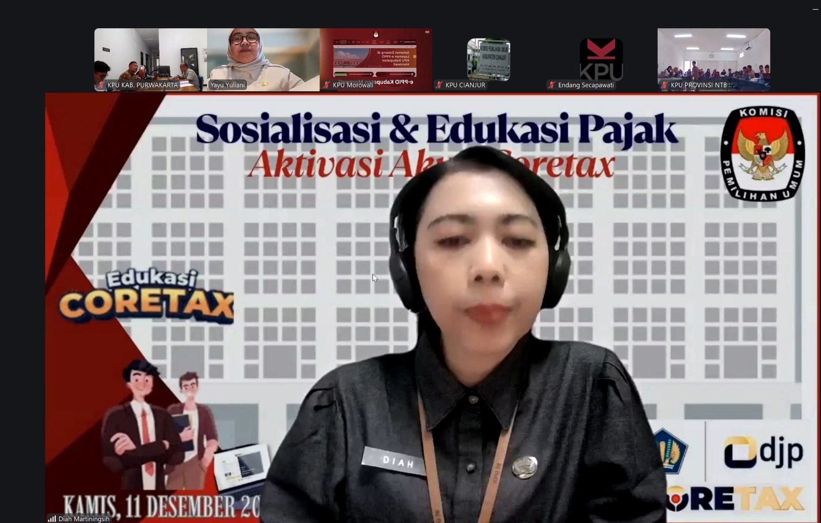 PURWAKARTA — Sekretariat Komisi Pemilihan Umum (KPU) Kabupaten Purwakarta menghadiri kegiatan Sosialisasi dan Edukasi Coretax yang diselenggarakan oleh Sekretariat Jenderal KPU RI bekerja sama dengan Direktorat Jenderal Pajak (DJP), pada Kamis (11/12). Kegiatan yang berlangsung secara daring ini diikuti oleh pejabat struktural, fungsional, serta ASN dari berbagai satuan kerja KPU, termasuk perwakilan KPU Purwakarta.