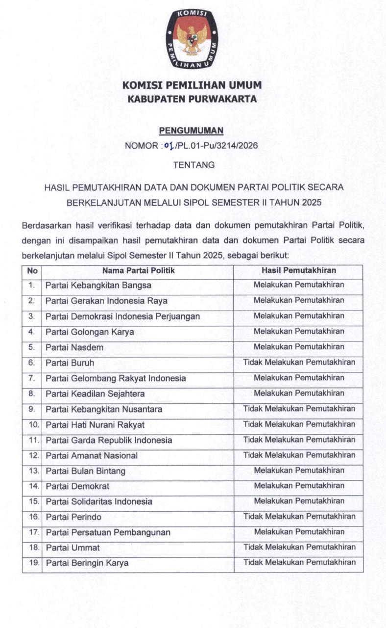 Pengumuman Nomor : 01/PL.01-Pu/3214/2026 Tentang Hasil Pemutakhiran Data dan Dokumen Partai Politik secara Berkelanjutan melalui Sipol Semester II Tahun 2025