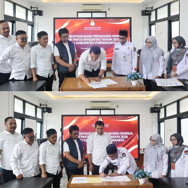 PURWAKARTA — Komisi Pemilihan Umum (KPU) Kabupaten Purwakarta melaksanakan Penandatanganan Perjanjian Kinerja dan Pakta Integritas Tahun 2026 pada Senin (19/1) bertempat di Aula Kantor KPU Kabupaten Purwakarta. Kegiatan ini dihadiri oleh seluruh jajaran KPU Kabupaten Purwakarta, meliputi Ketua dan Anggota KPU, Sekretaris, Kepala Subbagian, serta pelaksana sekretariat.