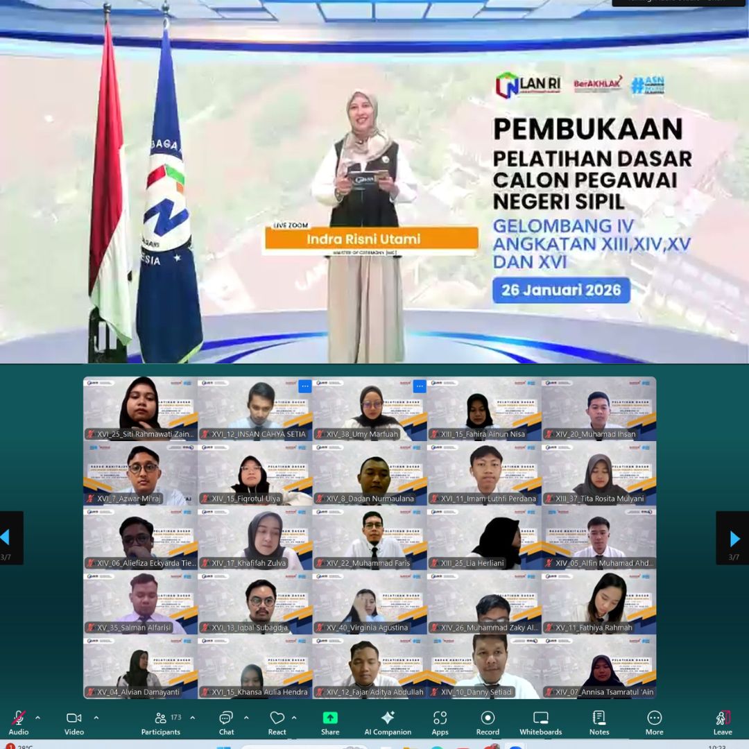 PURWAKARTA — Pelaksanaan Pelatihan Dasar (Latsar) Calon Pegawai Negeri Sipil (CPNS) Gelombang IV Tahun 2026 resmi dimulai pada Senin (26/1) dan diikuti oleh CPNS di lingkungan KPU, termasuk 5 (lima) CPNS Sekretariat KPU Kabupaten Purwakarta. Kegiatan dilaksanakan secara daring melalui Zoom Meeting sebagai bagian dari pembelajaran terpadu.