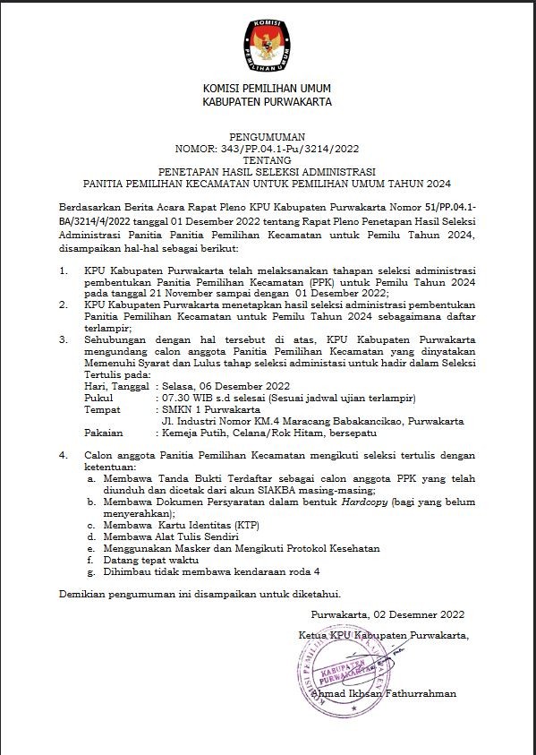 Berdasarkan Berita Acara Rapat Pleno KPU Kabupaten Purwakarta Nomor 51/PP.04.1-BA/3214/4/2022 tanggal 01 Desember 2022 tentang Rapat Pleno Penetapan Hasil Seleksi Administrasi Panitia Panitia Pemilihan Kecamatan untuk Pemilu Tahun 2024, disampaikan hal-hal sebagai berikut: