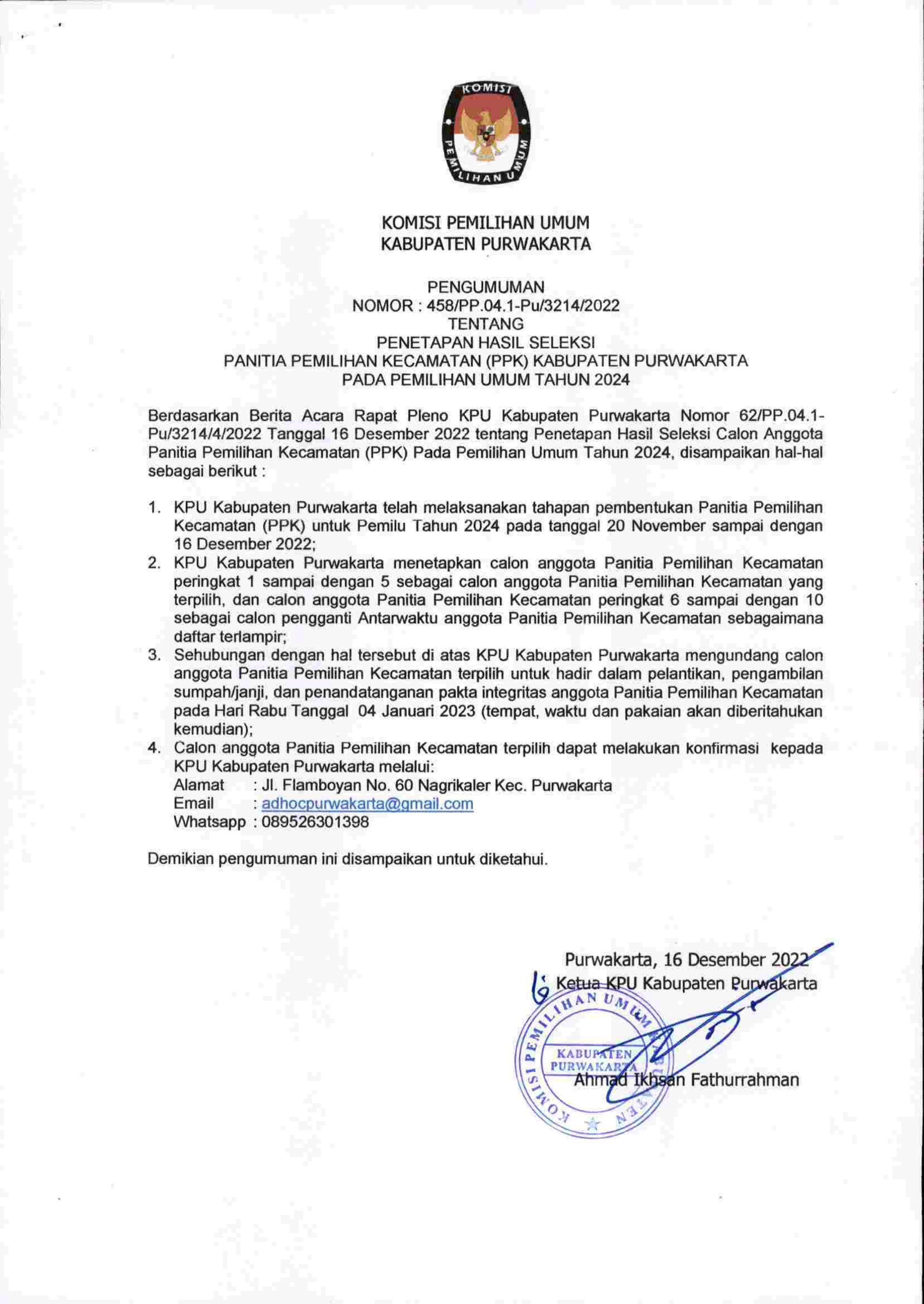 PENGUMUMAN Nomor : 458/PP.04.1-Pu/3214/2022 Tentang Penetapan Hasil Seleksi Anggota Panitia Pemilihan Kecamatan (PPK) pada Pemilihan Umum Tahun 2024