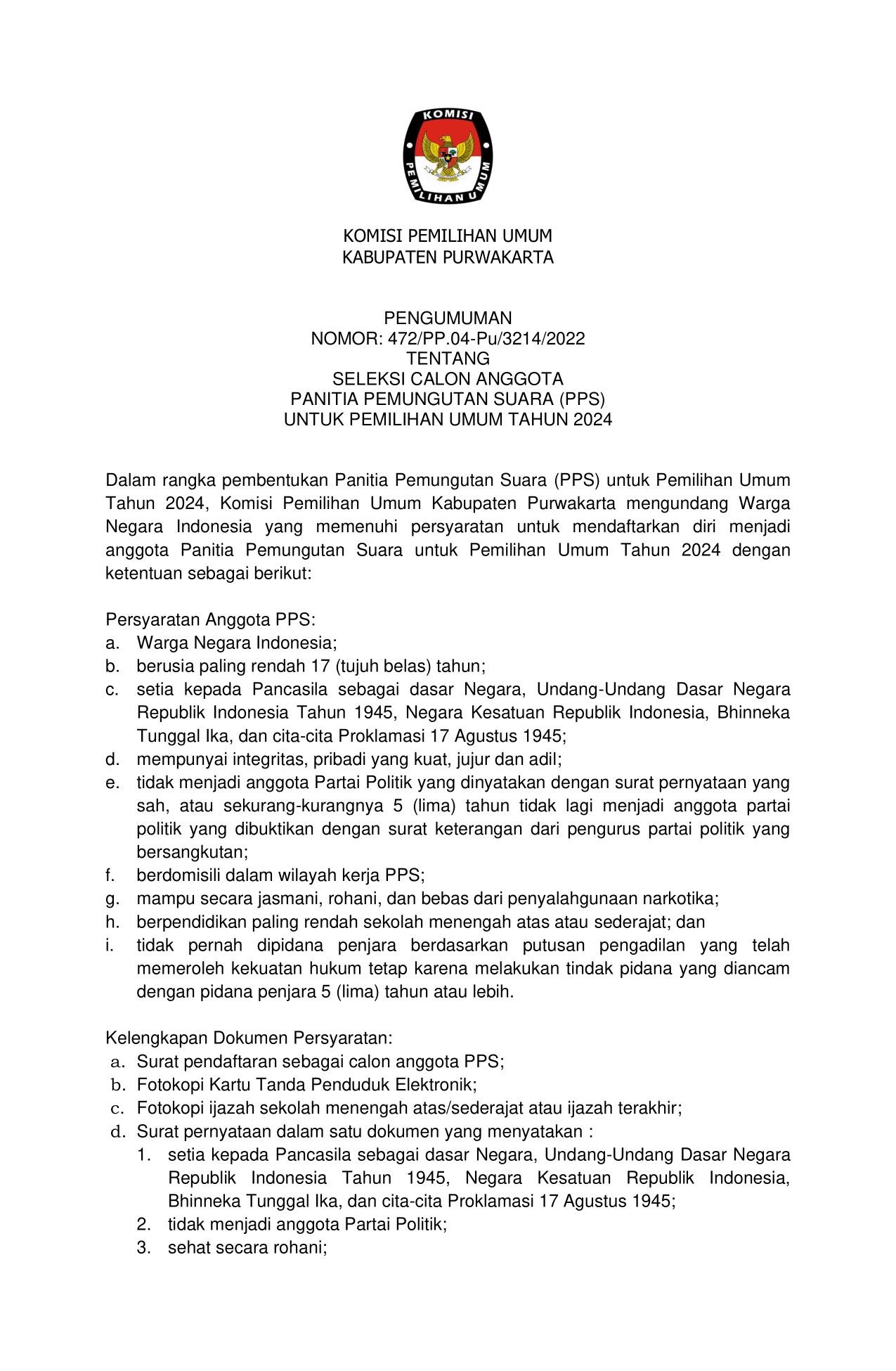 PENGUMUMAN NOMOR: 472/PP.04-Pu/3214/2022 TENTANG SELEKSI CALON ANGGOTA PANITIA PEMUNGUTAN SUARA (PPS) UNTUK PEMILIHAN UMUM TAHUN 2024