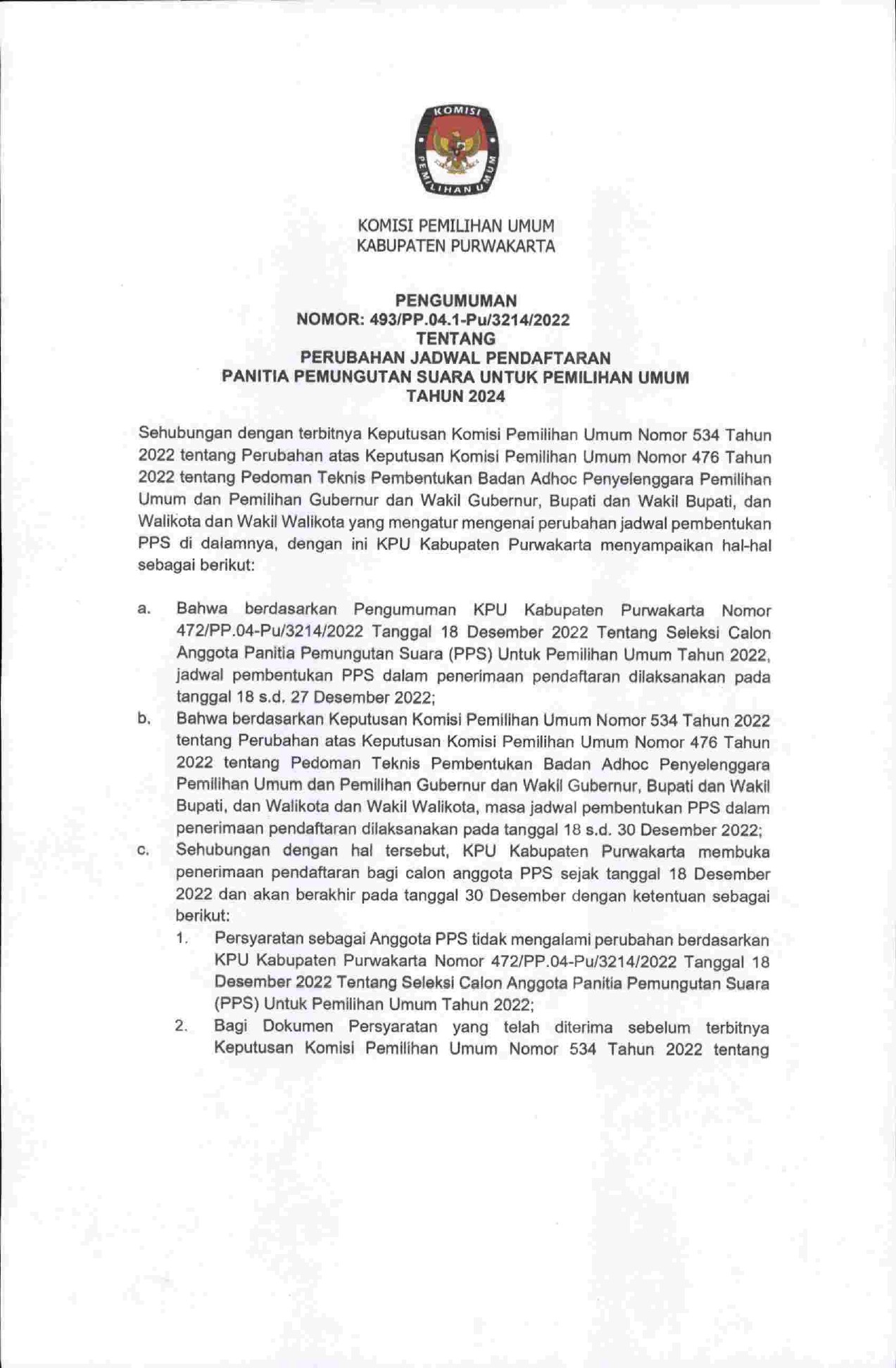 PENGUMUMAN NOMOR: 493/PP.04.1-Pu/3214/2022 TENTANG PERUBAHAN JADWAL PENDAFTARAN PANITIA PEMUNGUTAN SUARA UNTUK PEMILIHAN UMUM TAHUN 2024