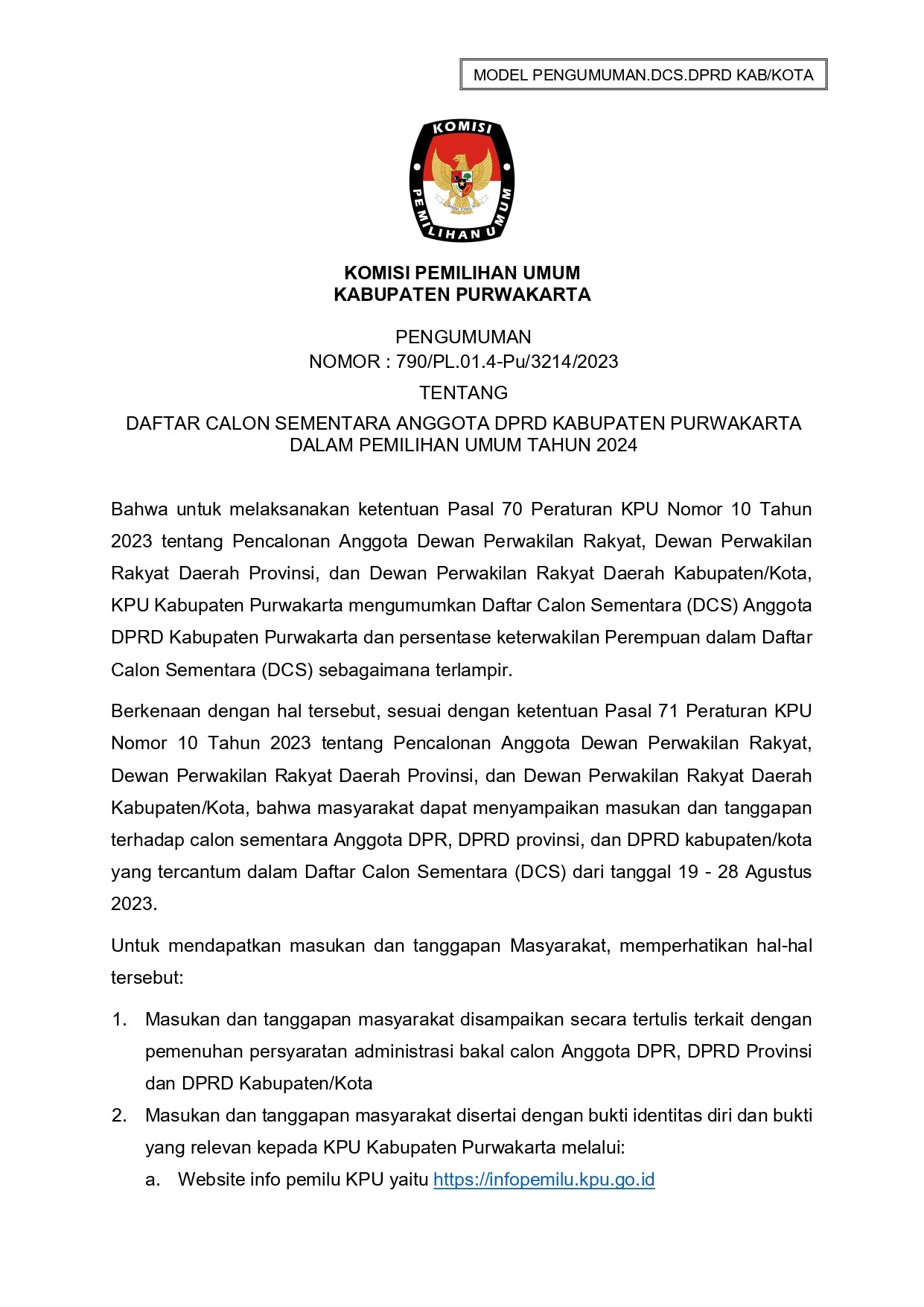 PENGUMUMAN NOMOR : 790/PL.01.4-Pu/3214/2023 TENTANG DAFTAR CALON SEMENTARA ANGGOTA DPRD KABUPATEN PURWAKARTA DALAM PEMILIHAN UMUM TAHUN 2024 Jumat, 18 Agustus 2023 00:00 2667 Untuk selengkapnya klik link ini : Pengumuman DCS Bagikan: Telah dilihat 2,667 kali
