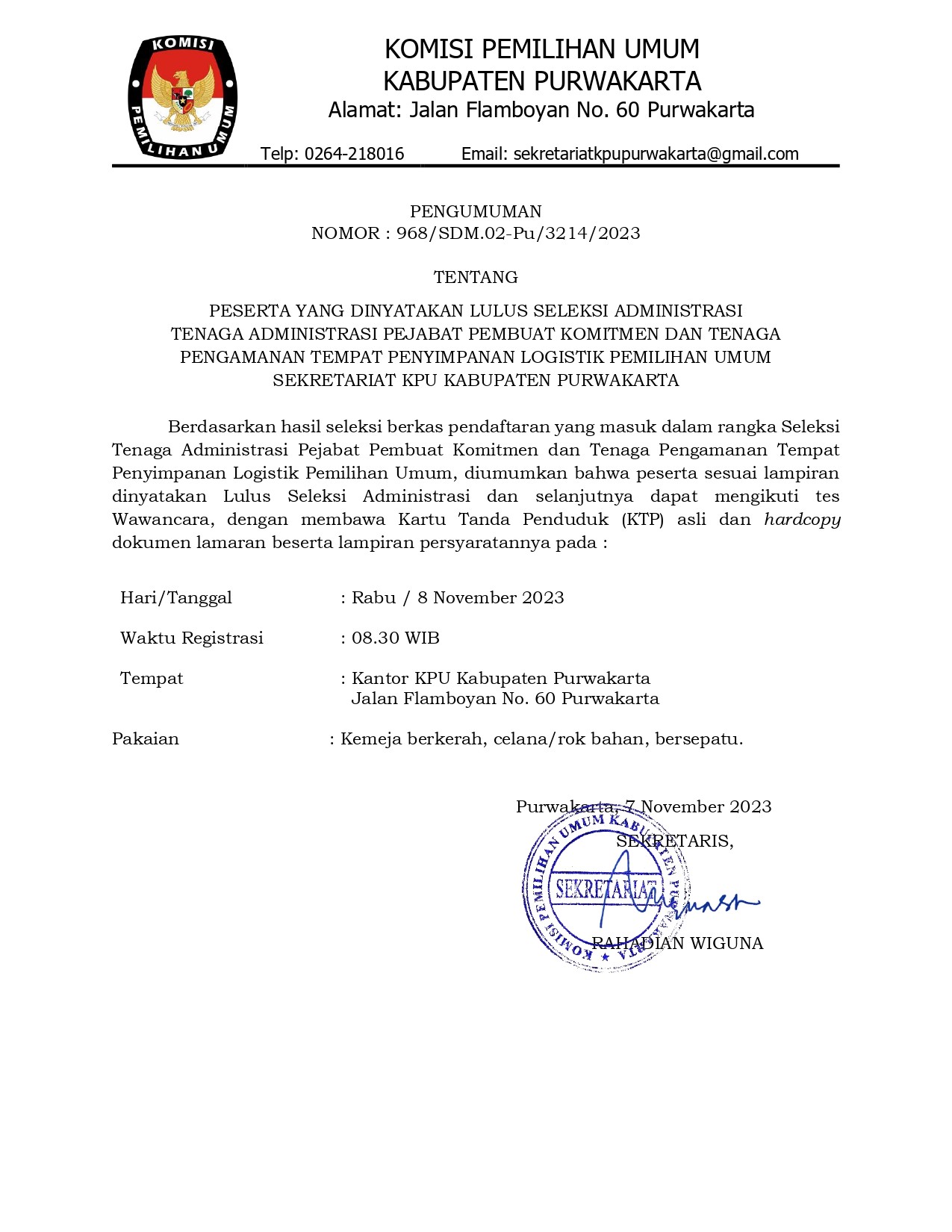 Pengumuman Nomor : 968/SDM.02-Pu/3214/2023 Tentang Peserta yang Dinyatakan Lulus Seleksi Administrasi Tenaga Administrasi Pejabat Pembuat Komitmen dan Tenaga Pengamanan Tempat Penyimpanan Logistik Pemilihan Umum Sekretariat KPU Kabupaten Purwakarta, untuk selengkapnya : PENGUMUMAN NOMOR : 968/SDM.02-Pu/3214/2023