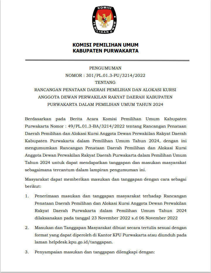 PENGUMUMAN TENTANG RANCANGAN PENATAAN DAERAH PEMILIHAN DAN ALOKASI KURSI ANGGOTA DEWAN PERWAKILAN RAKYAT DAERAH KABUPATEN PURWAKARTA DALAM PEMILIHAN UMUM TAHUN 2024
