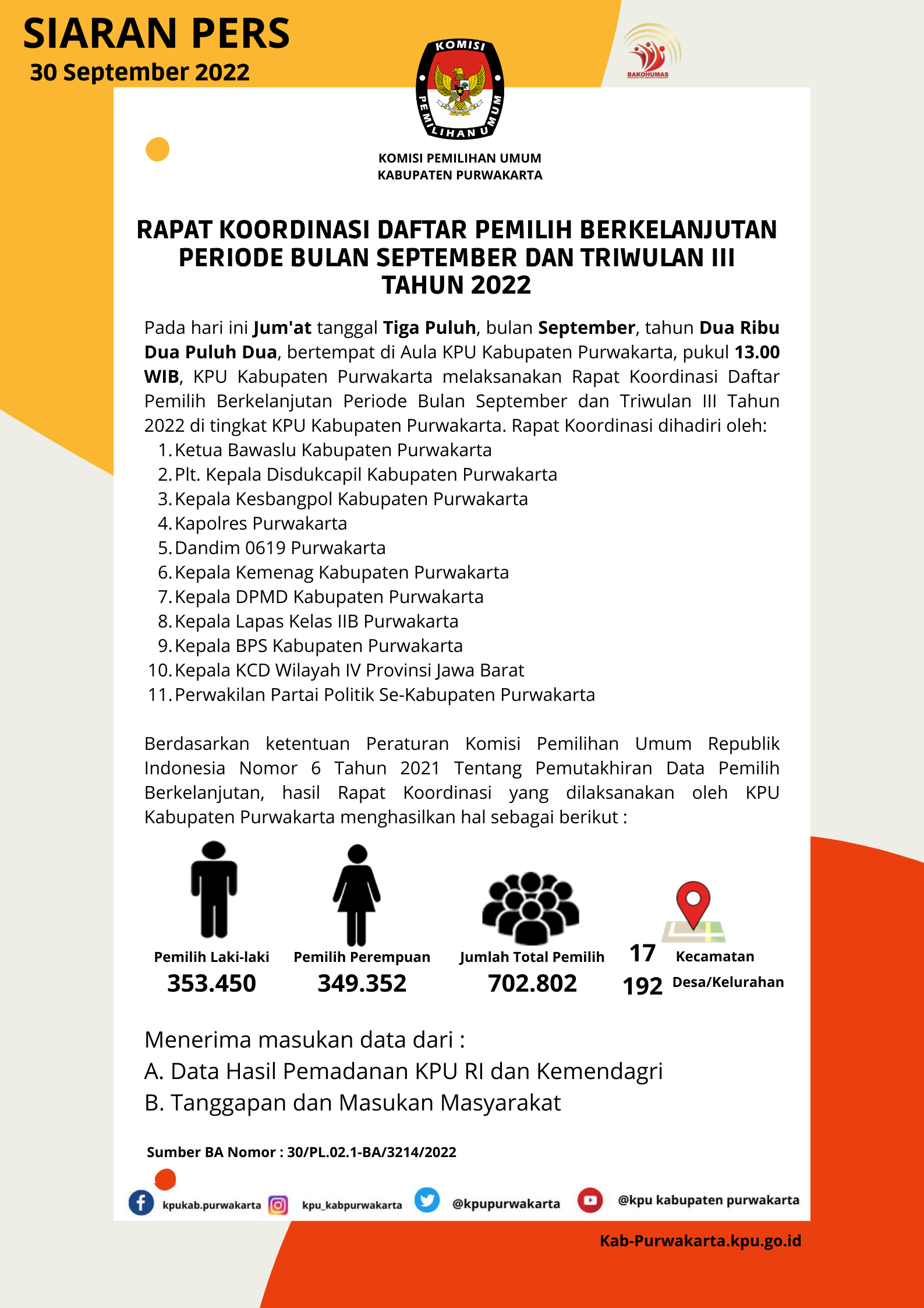 Pada hari ini Jum'at tanggal Tiga Puluh, bulan September, tahun Dua Ribu Dua Puluh Dua, bertempat di Aula KPU Kabupaten Purwakarta, pukul 13.00 WIB, KPU Kabupaten Purwakarta melaksanakan Rapat Koordinasi Daftar Pemilih Berkelanjutan Periode Bulan September dan Triwulan III Tahun 2022 di tingkat KPU Kabupaten Purwakarta. Rapat Koordinasi dihadiri oleh: Ketua Bawaslu Kabupaten Purwakarta, Plt. Kepala Disdukcapil Kabupaten Purwakarta, Kepala Kesbangpol Kabupaten Purwakarta, Kapolres Purwakarta, Dandim 0619 Purwakarta, Kepala Kemenag Kabupaten Purwakarta, Kepala DPMD Kabupaten Purwakarta, Kepala Lapas Kelas IIB Purwakarta, Kepala BPS Kabupaten Purwakarta, Kepala KCD Wilayah IV Provinsi Jawa Barat dan Perwakilan Partai Politik Se-Kabupaten Purwakarta