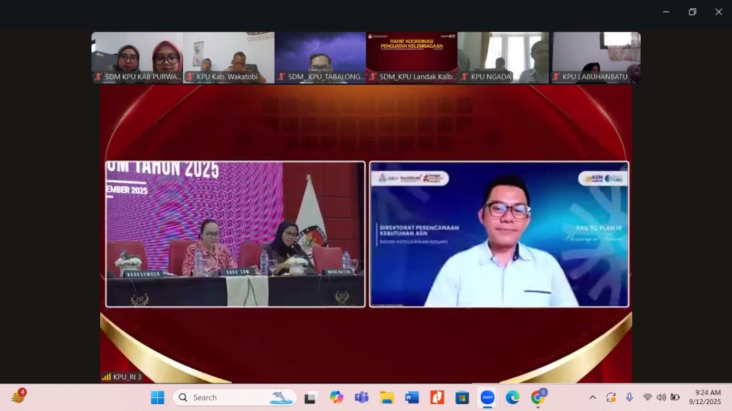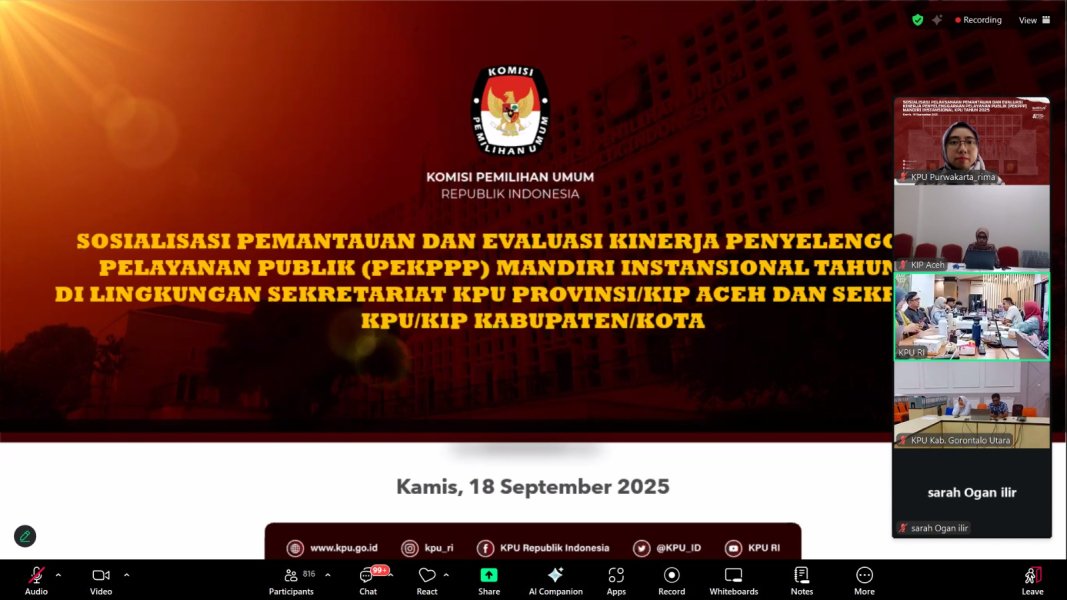 Purwakarta — Sekretariat Jenderal KPU RI menyelenggarakan Sosialisasi dalam rangka Pelaksanaan PЕКРРР Mandiri Instansional KPU Tahun 2025, Kamis (18/9/2025), secara daring. Kegiatan ini diikuti oleh Sekretariat KPU Provinsi/KIP Aceh serta Sekretariat KPU/KIP Kabupaten/Kota se-Indonesia, termasuk Sekretariat KPU Kabupaten Purwakarta. Kegiatan dibuka oleh Kepala Bagian Organisasi dan Tata Laksana (Ortala) Setjen KPU, yang menyampaikan bahwa pelaksanaan PЕКРРР Mandiri merupakan bagian dari evaluasi pelayanan publik di lingkungan KPU. Evaluasi ini mencakup enam aspek penting, yaitu kebijakan layanan, profesionalisme sumber daya manusia, sarana dan prasarana, sistem informasi, mekanisme konsultasi dan pengaduan, serta inovasi pelayanan publik. Dalam sesi berikutnya, peserta memperoleh penjelasan teknis mengenai tata cara pengisian formulir evaluasi yang harus dilengkapi oleh masing-masing satuan kerja. Proses ini menekankan pentingnya kelengkapan data dan keakuratan informasi sebagai dasar penilaian. Kegiatan ditutup dengan amanat dari Kepala Bagian Perencanaan dan Organisasi (Rensi) Setjen KPU, yang menekankan perlunya optimalisasi dalam penyusunan serta pengunggahan bukti dukung evaluasi. Hal ini diharapkan dapat meningkatkan kualitas pelayanan publik di lingkungan KPU, sekaligus memperkuat komitmen kelembagaan terhadap transparansi, akuntabilitas, dan kepuasan masyarakat. Humas KPU Kabupaten Purwakarta Narasi & Foto: R.Hutomo