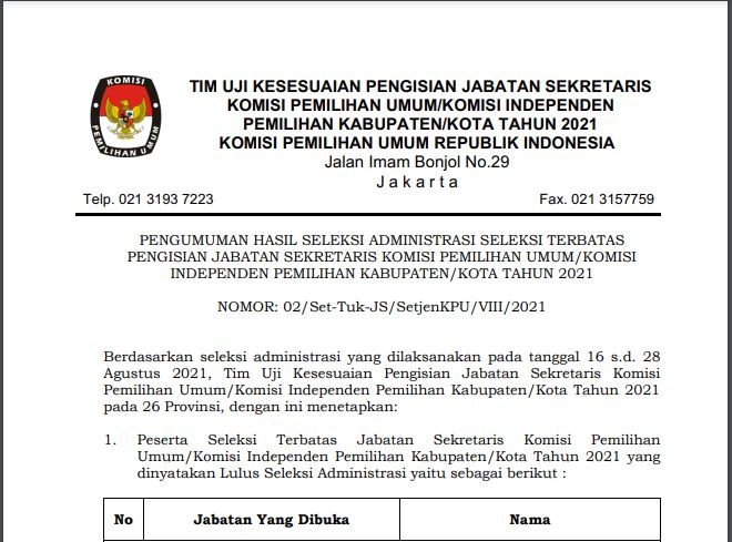 KPU Kabupaten Purwakarta menetapkan hasil seleksi administrasi pembentukan Panitia Pemilihan Kecamatan untuk Pemilu Tahun 2024 sebagaimana daftar terlampir;