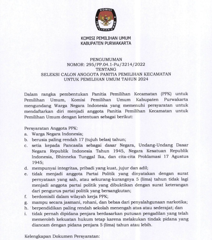 Berdasarkan Berita Acara Rapat Pleno KPU Kabupaten Purwakarta Nomor 51/PP.04.1-BA/3214/4/2022 tanggal 01 Desember 2022 tentang Rapat Pleno Penetapan Hasil Seleksi Administrasi Panitia Panitia Pemilihan Kecamatan untuk Pemilu Tahun 2024, disampaikan hal-hal sebagai berikut: