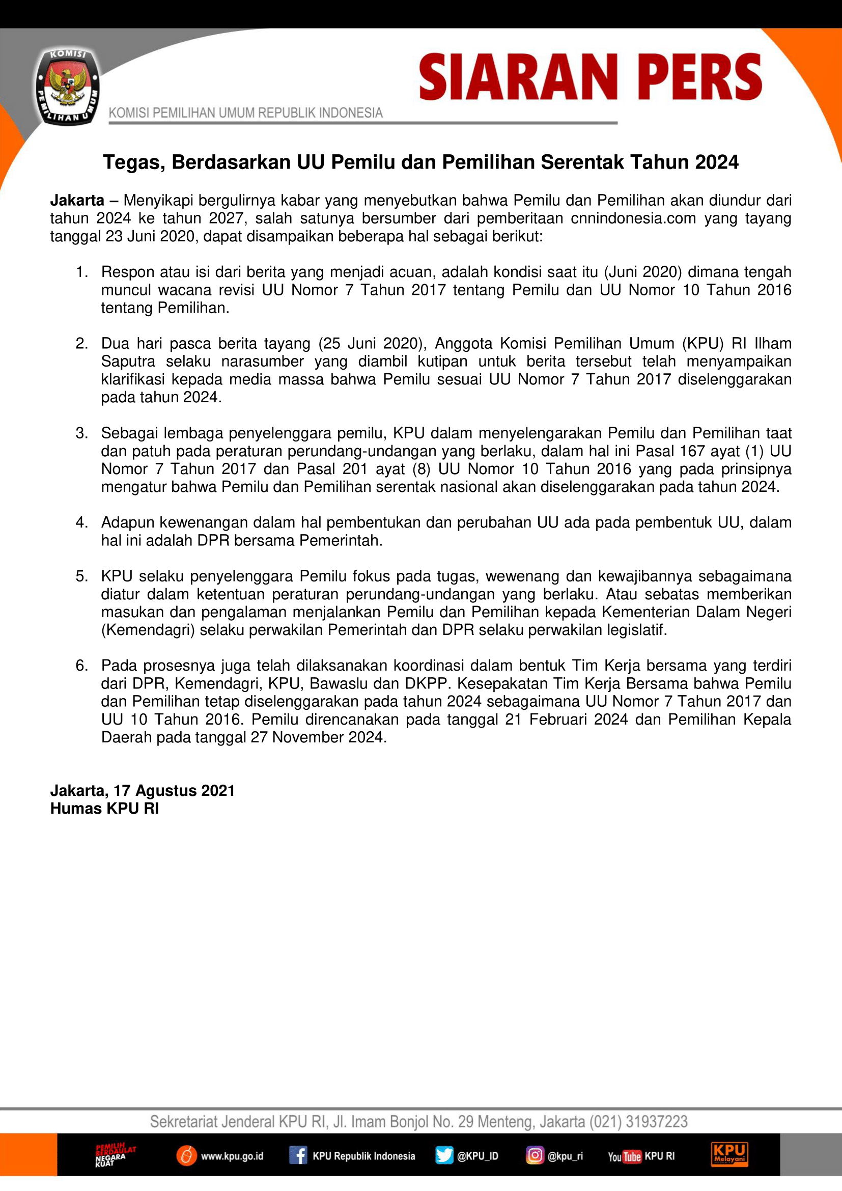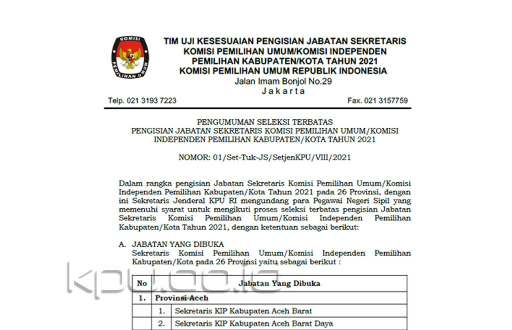 Jakarta, kpu.go.id - Dalam rangka pengisian Jabatan Sekretaris Komisi Pemilihan Umum/Komisi Independen Pemilihan Kabupaten/Kota Tahun 2021 pada 26 Provinsi, dengan ini Sekretaris Jenderal KPU RI mengundang para Pegawai Negeri Sipil yang memenuhi syarat untuk mengikuti proses seleksi terbatas pengisian Jabatan Sekretaris Komisi Pemilihan Umum/Komisi Independen Pemilihan Kabupaten/Kota Tahun 2021, dengan ketentuan yang tertuang pada Pengumuman Seleksi Terbatas Pengisian Jabatan Sekretaris KPU/KIP Kabupaten/Kota Tahun 2021 Nomor: 01/Set-Tuk-JS/SetjenKPU/VIII/2021 . Selengkapnya... [ KLIK DI SINI ] Dokumen Kelengkapan Lampiran: Lampiran A.1 A.2 dan A.3-Persetujuan PPK (bagi PNS Organik dan DPK atau Non Organik) [ Download ] Lampiran B-Pakta Integritas di atas materai Rp. 10.000 [ Download ] Lampiran C-Daftar Riwayat Hidup (CV) [ Download ] Lampiran D-Surat Lamaran dengan ditandatangani di atas materai Rp. 10.000 [ Download ] Lampiran E-Surat pernyataan tidak sedang menjalani hukuman disiplin tingkat sedang atau berat [ Download ] Lampiran F-Tidak Pernah Mendapat Sanksi Kode Etik Penyelenggara Pemilu [ Download ] Lampiran G-Tidak Memiliki atau Memiliki Hubungan Keluarga dengan Ketua, Anggota dan Pejabat Setjen KPU [ Download ]