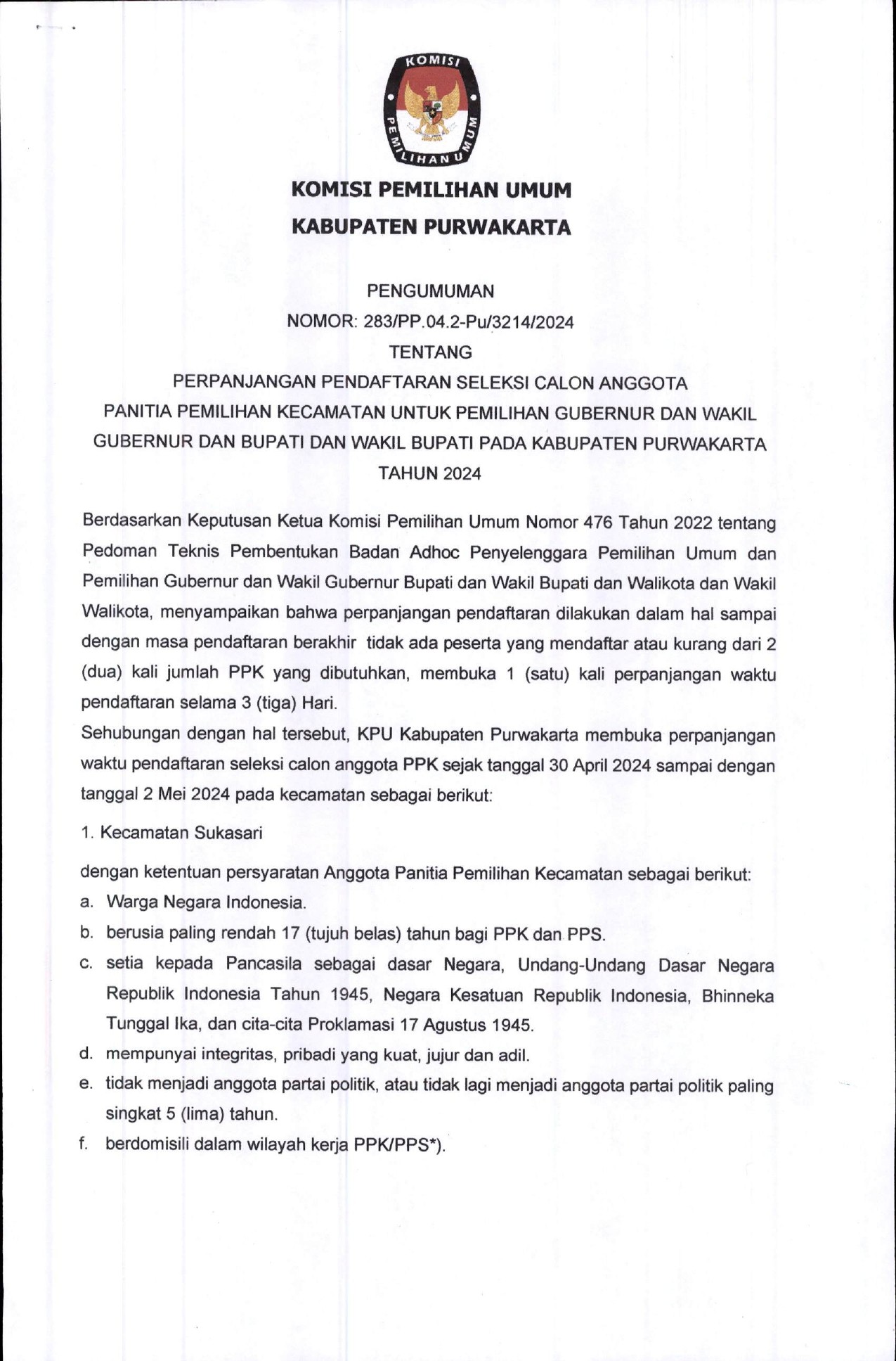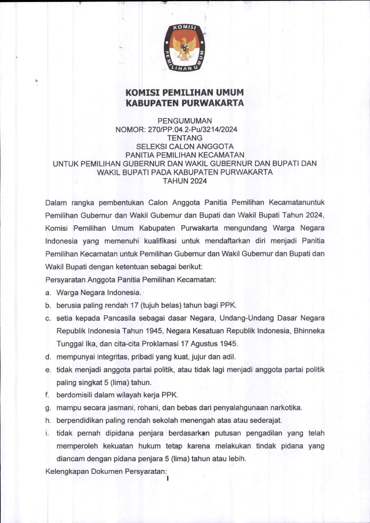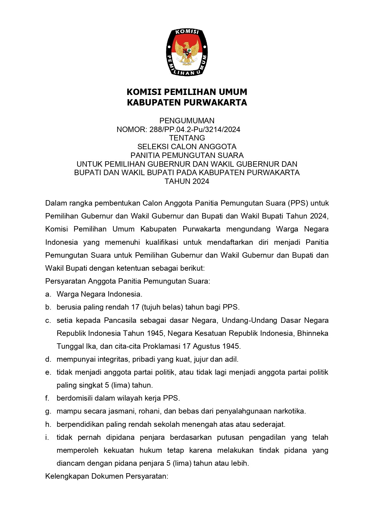 Dalam rangka pembentukan Calon Anggota Panitia Pemungutan Suara (PPS) untuk Pemilihan Gubernur dan Wakil Gubernur dan Bupati dan Wakil Bupati Tahun 2024, Komisi Pemilihan Umum Kabupaten Purwakarta mengundang Warga Negara Indonesia yang memenuhi kualifikasi untuk mendaftarkan diri menjadi Panitia Pemungutan Suara untuk Pemilihan Gubernur dan Wakil Gubernur dan Bupati dan Wakil Bupati dengan ketentuan sebagai berikut: Persyaratan Anggota Panitia Pemungutan Suara: a. Warga Negara Indonesia. b. berusia paling rendah 17 (tujuh belas) tahun bagi PPS. c. setia kepada Pancasila sebagai dasar Negara, Undang-Undang Dasar Negara Republik Indonesia Tahun 1945, Negara Kesatuan Republik Indonesia, Bhinneka Tunggal Ika, dan cita-cita Proklamasi 17 Agustus 1945. d. mempunyai integritas, pribadi yang kuat, jujur dan adil. e. tidak menjadi anggota partai politik, atau tidak lagi menjadi anggota partai politik paling singkat 5 (lima) tahun. f. berdomisili dalam wilayah kerja PPS. g. mampu secara jasmani, rohani, dan bebas dari penyalahgunaan narkotika. h. berpendidikan paling rendah sekolah menengah atas atau sederajat. i. tidak pernah dipidana penjara berdasarkan putusan pengadilan yang telah memperoleh kekuatan hukum tetap karena melakukan tindak pidana yang diancam dengan pidana penjara 5 (lima) tahun atau lebih. untuk selengkapnya unduh dan lihat (UNDUH DISINI)