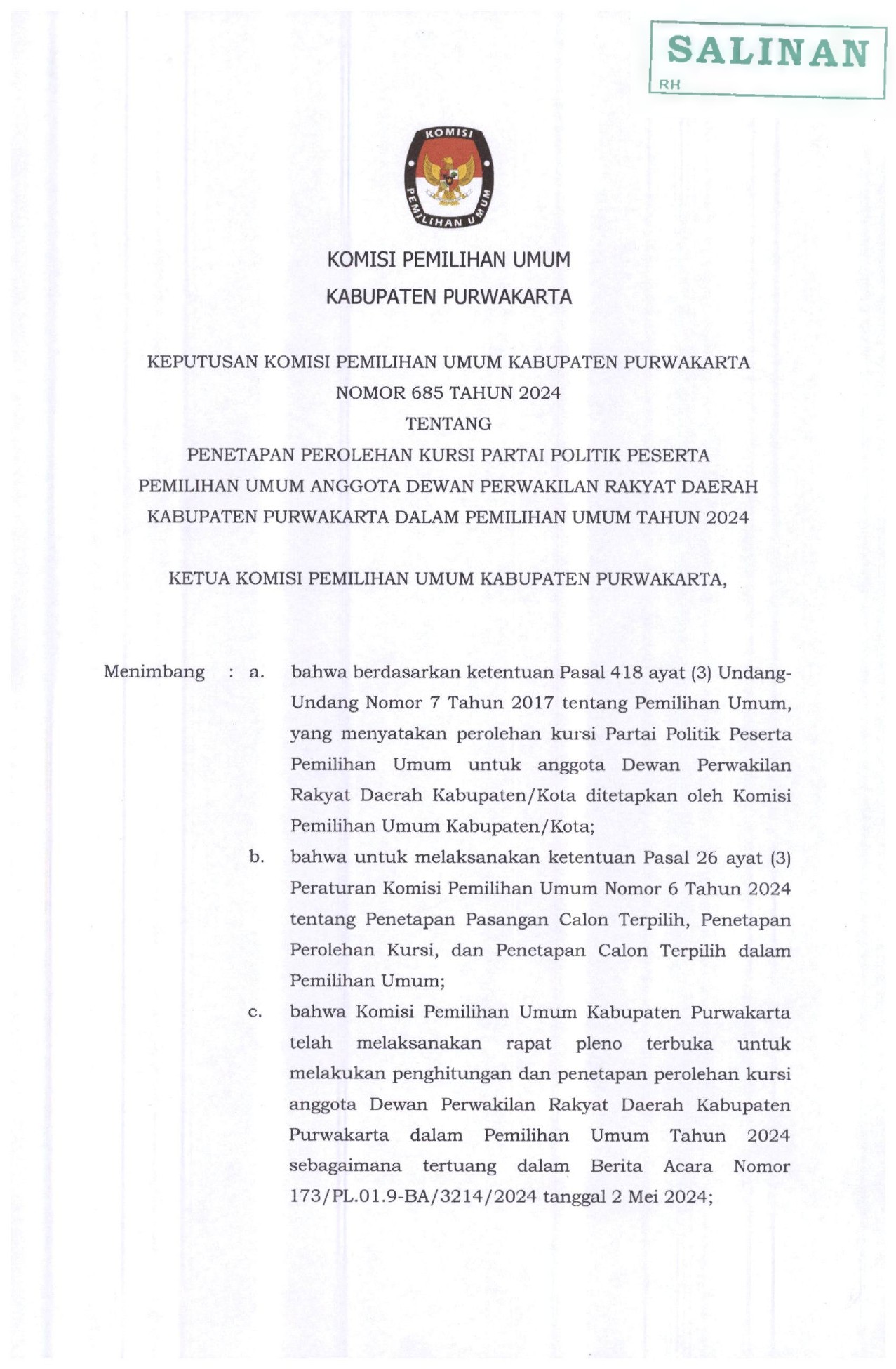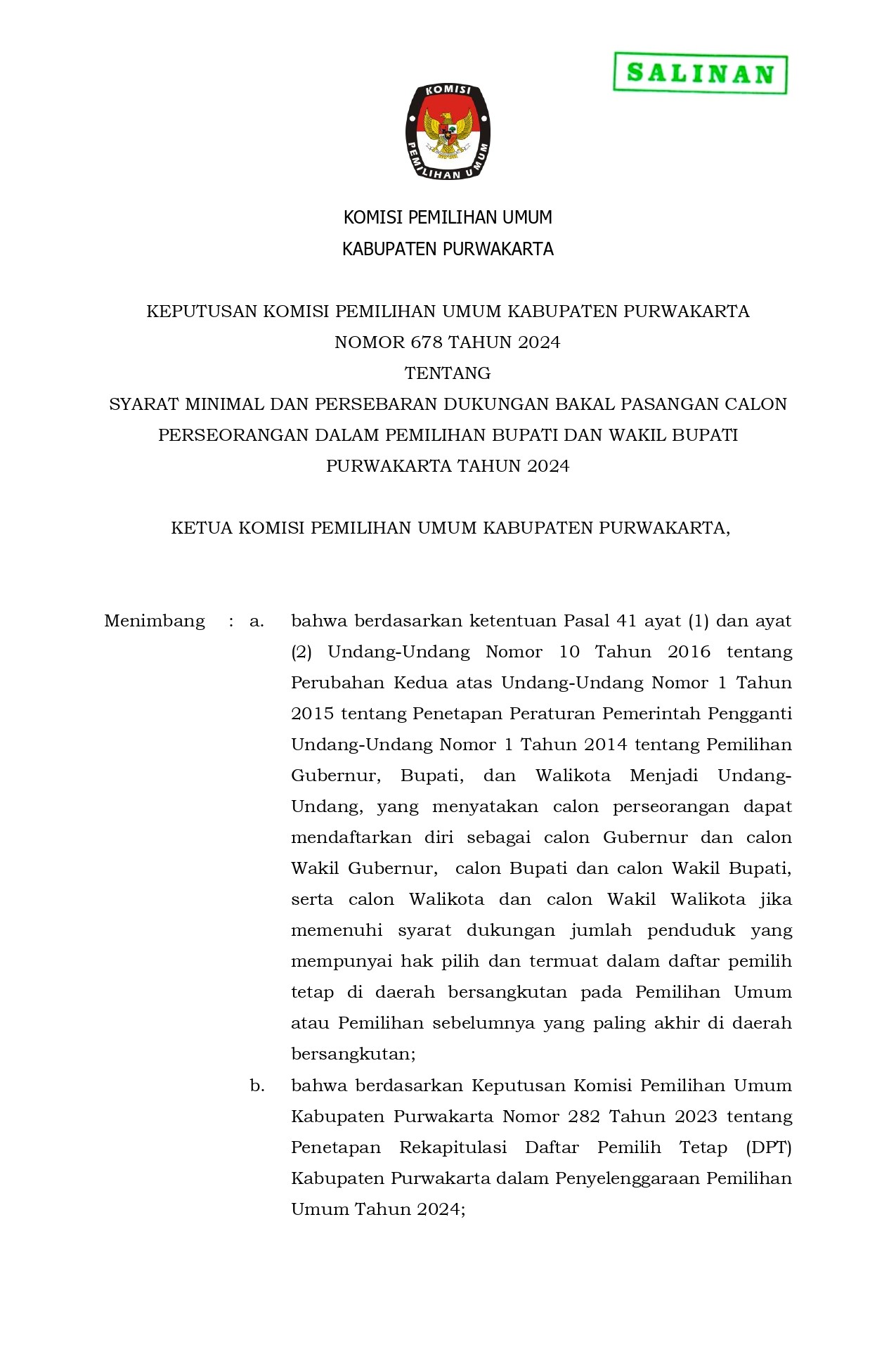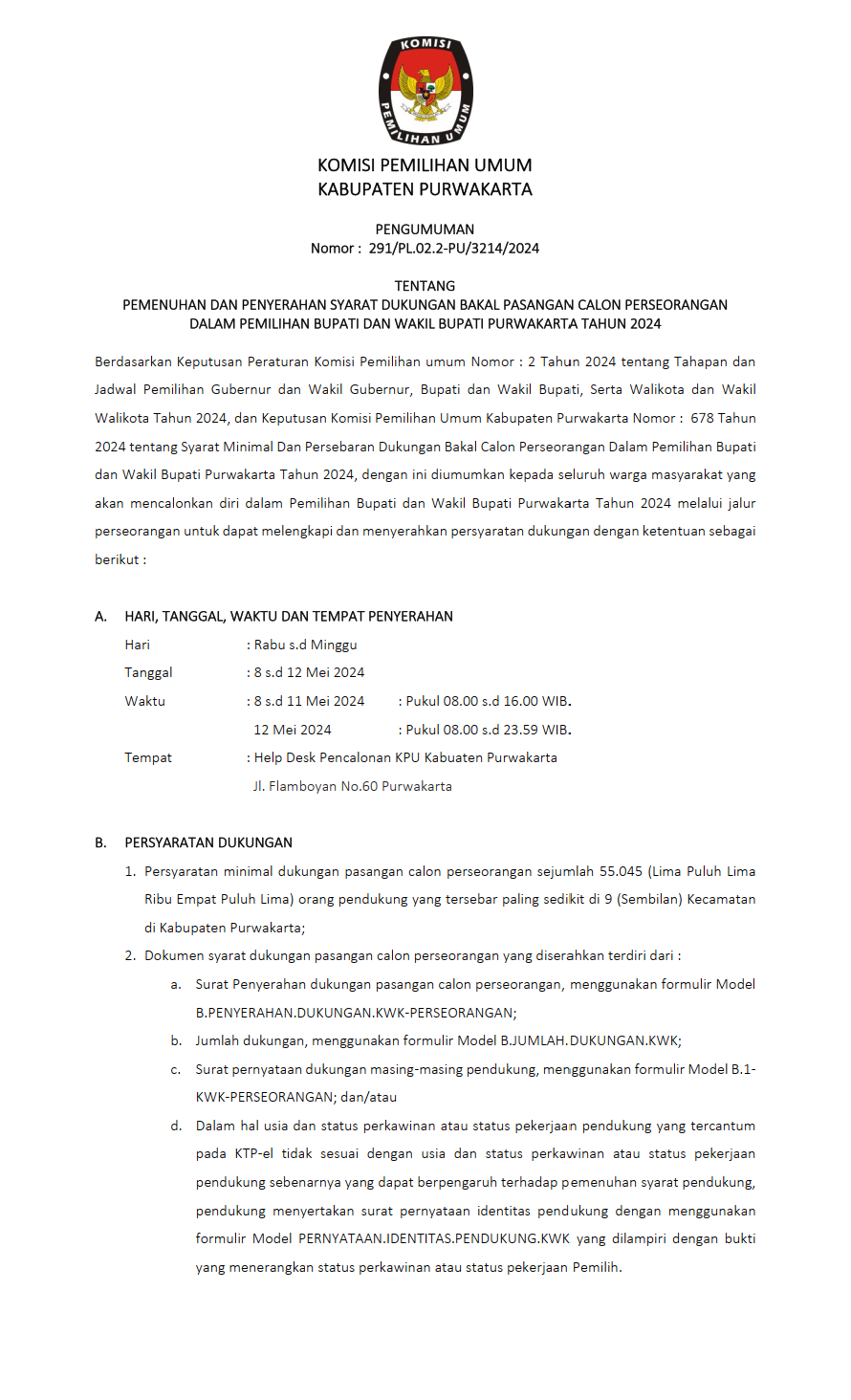 Dalam rangka pembentukan Calon Anggota Panitia Pemungutan Suara (PPS) untuk Pemilihan Gubernur dan Wakil Gubernur dan Bupati dan Wakil Bupati Tahun 2024, Komisi Pemilihan Umum Kabupaten Purwakarta mengundang Warga Negara Indonesia yang memenuhi kualifikasi untuk mendaftarkan diri menjadi Panitia Pemungutan Suara untuk Pemilihan Gubernur dan Wakil Gubernur dan Bupati dan Wakil Bupati dengan ketentuan sebagai berikut: Persyaratan Anggota Panitia Pemungutan Suara: a. Warga Negara Indonesia. b. berusia paling rendah 17 (tujuh belas) tahun bagi PPS. c. setia kepada Pancasila sebagai dasar Negara, Undang-Undang Dasar Negara Republik Indonesia Tahun 1945, Negara Kesatuan Republik Indonesia, Bhinneka Tunggal Ika, dan cita-cita Proklamasi 17 Agustus 1945. d. mempunyai integritas, pribadi yang kuat, jujur dan adil. e. tidak menjadi anggota partai politik, atau tidak lagi menjadi anggota partai politik paling singkat 5 (lima) tahun. f. berdomisili dalam wilayah kerja PPS. g. mampu secara jasmani, rohani, dan bebas dari penyalahgunaan narkotika. h. berpendidikan paling rendah sekolah menengah atas atau sederajat. i. tidak pernah dipidana penjara berdasarkan putusan pengadilan yang telah memperoleh kekuatan hukum tetap karena melakukan tindak pidana yang diancam dengan pidana penjara 5 (lima) tahun atau lebih. untuk selengkapnya unduh dan lihat (UNDUH DISINI)