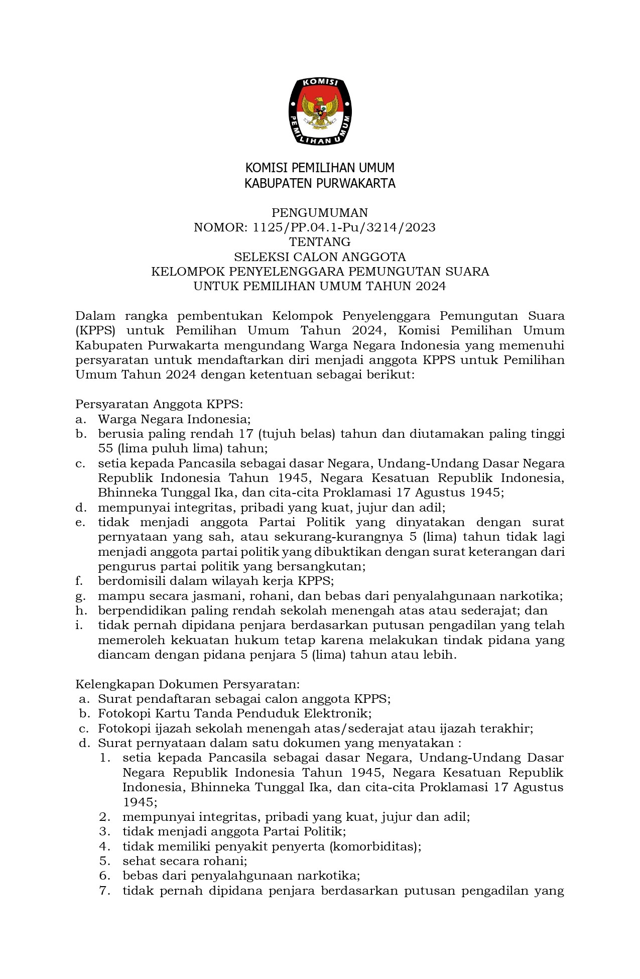 PENGUMUMAN NOMOR : 961/PL.01.4-Pu/3214/2023 TENTANG DAFTAR CALON TETAP ANGGOTA DEWAN PERWAKILAN RAKYAT DAERAH KABUPATEN PURWAKARTA DALAM PEMILIHAN UMUM TAHUN 2024, UNTUK SELENGKAPNYA KLIK LINK BERIKUT : PENGUMUMAN DCT