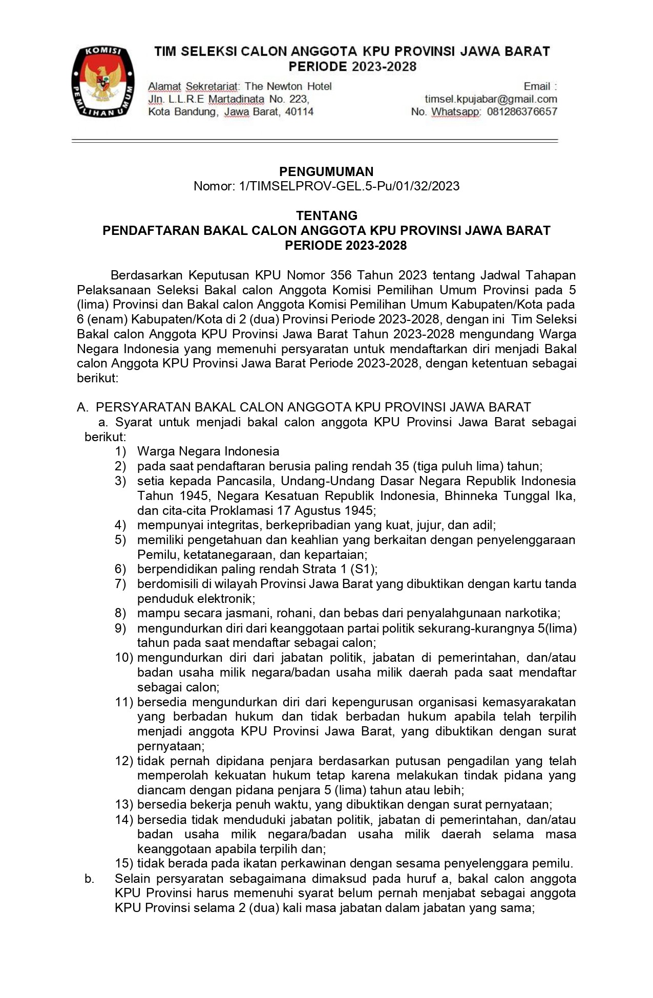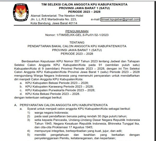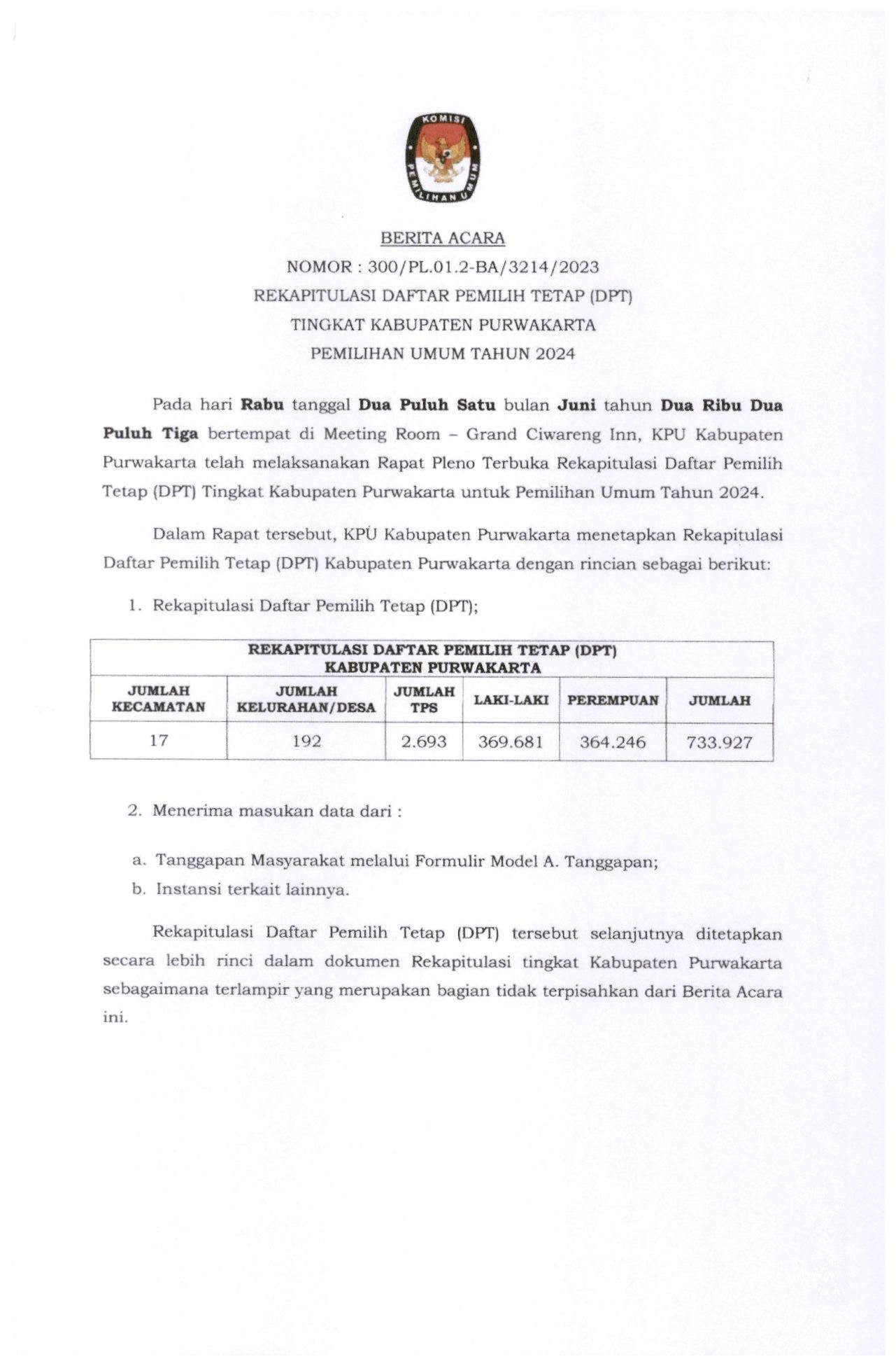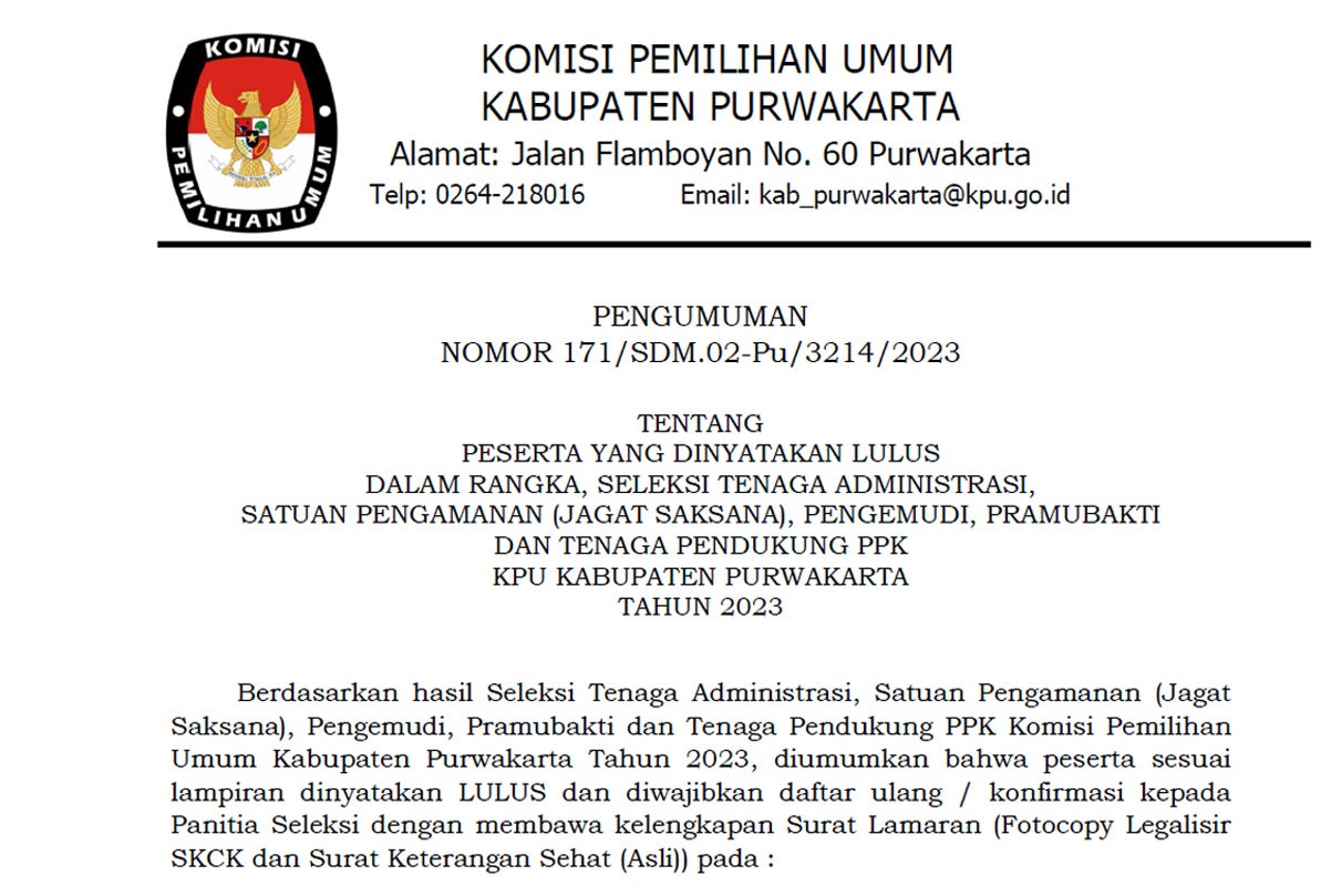 PENGUMUMAN NOMOR 171/SDM.02-Pu/3214/2023 TENTANG PESERTA YANG DINYATAKAN LULUS DALAM RANGKA, SELEKSI TENAGA ADMINISTRASI, SATUAN PENGAMANAN (JAGAT SAKSANA), PENGEMUDI, PRAMUBAKTI DAN TENAGA PENDUKUNG PPK KPU KABUPATEN PURWAKARTA TAHUN 2023. Lihat atau unduh silahkan KLIKDISINI !