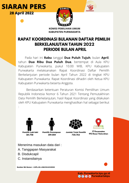 Berdasarkan ketentuan Peraturan Komisi Pemilihan Umum Republik Indonesia Nomor 6 Tahun 2021 Tentang Pemutakhiran Data Pemilih Berkelanjutan, hasil Rapat Koordinasi yang dilakukan oleh KPU Kabupaten Purwakarta menghasilkan hal sebagai berikut :