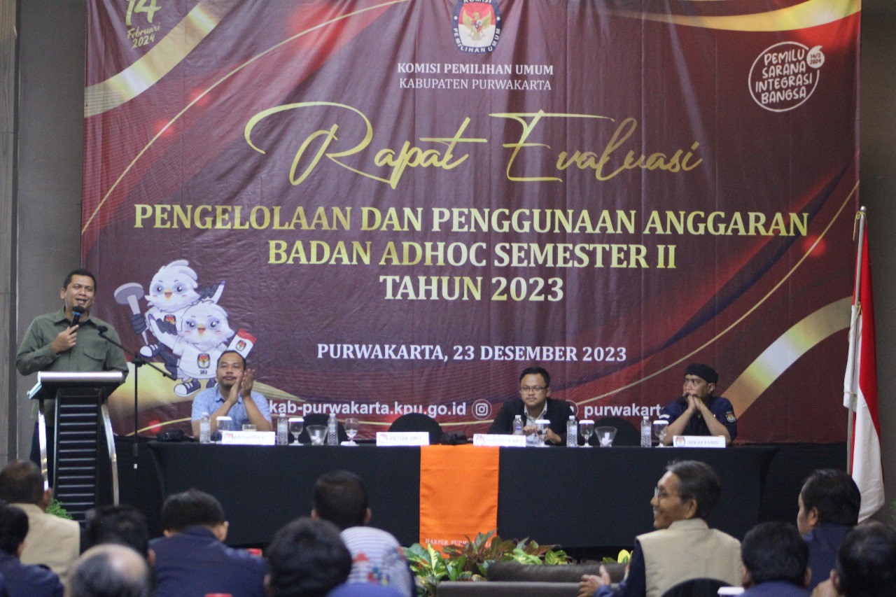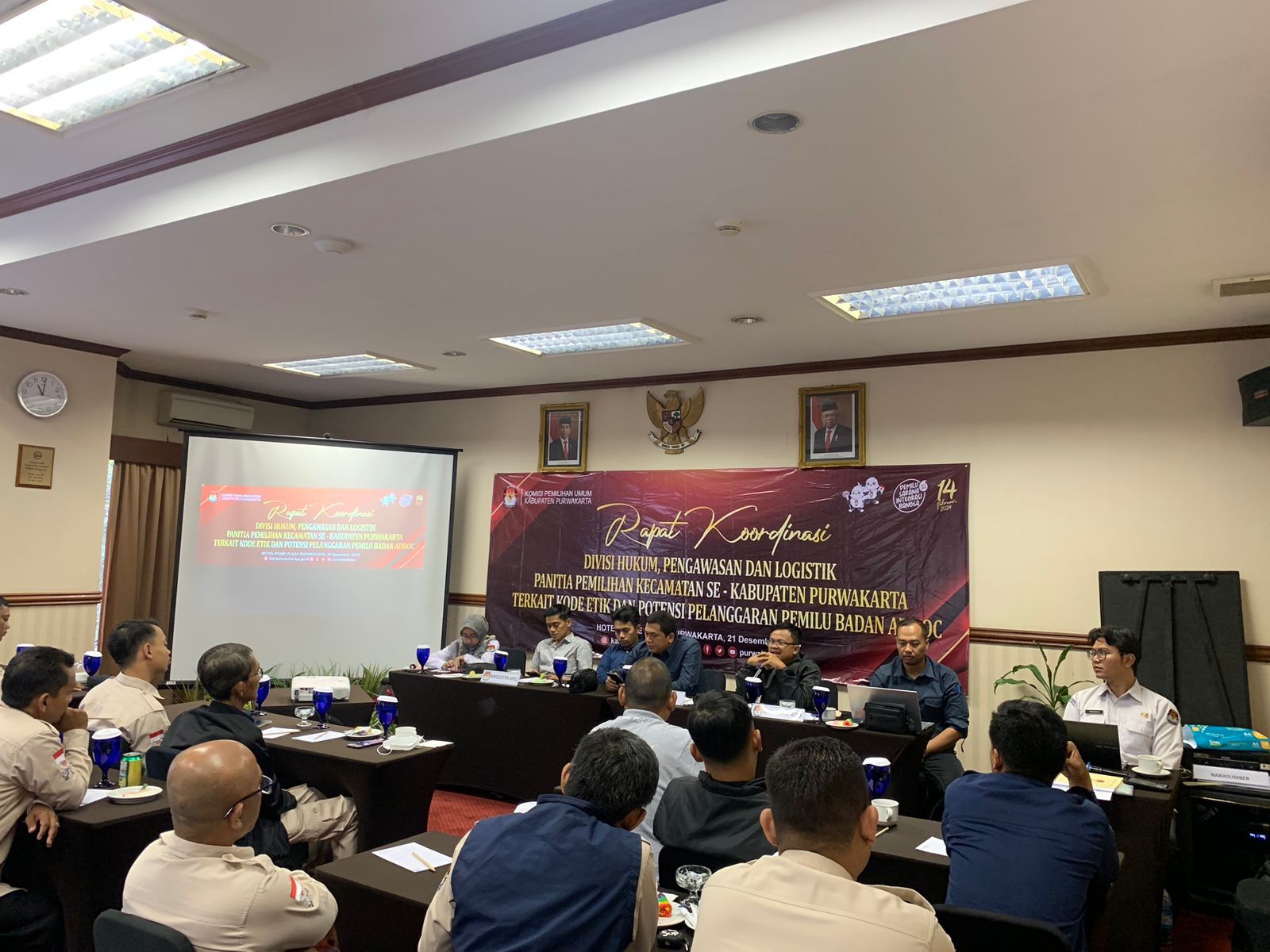 Purwakarta, kab-purwakarta.kpu.go.id – Komisi Pemilihan Umum (KPU) Kabupaten Purwakarta mengadakan rapat koordinasi divisi hukum, pengawasan dan logistik bersama ketua serta ketua divisi terkait Panitia Pemilihan Kecamatan se-Kabupaten Purwakarta di Purwakarta, Kamis (21/12/2023). Kegiatan rakor dimulai dengan sambutan rapat oleh Dian Hadiana selaku Ketua KPU Kabupaten Purwakarta yang menyampaikan bahwa fungsi divisi hukum pada PPK yaitu memitigasi potensi pelanggaran dengan melakukan pengawasan internal. “Fungi divisi hukum di tingkat PPK yaitu memantau dan memitigasi potensi terjadinya pelanggaran Pemilu serta melakukan pengawasan internal Badan Adhoc.” Ujar Dian (21/12/2023). Pada kesempatan yang sama Komisioner KPU Kabupaten Purwakarta memebrikan arahan serta update perkembangan tahapan yang sedang dijalani sesuai dengan masing-masing divisi yang diampu. Kegiatan dihadiri oleh Siti Nurhayati selaku Anggota Bawaslu Kabupaten Purwakarta dan Firman Manan selaku Akademisi Universitas Padjajaran yang keduanya juga sebagai narasumber. Siti Nurhayati dalam materinya menjelaskan terkait regulasi yang mengatur jenis pelanggarann dalam Pemilu, kemudian dilengkapi oleh Firman Manan yang menjelaskan banyak terkait kode etik Penyelenggara Pemilu sebagai system nilai yang mengikat perilaku Penyelenggara Pemilu dalam menyelenggarakan tahapan Pemilu. Turut hadir Kadiv Hukum dan Pengawasan, Kadiv Perencanaan, Data dan Informasi, Kadiv Sosialisasi, Pendidikan Pemilih, Partisipasi Masyarakat dan SDM, Kadiv Teknis Penyelenggaraan Pemilu, beserta jajaran Sekretariat KPU Kabupaten Purwakarta. (humas kpu pwk PPdrio/foto:Rama)