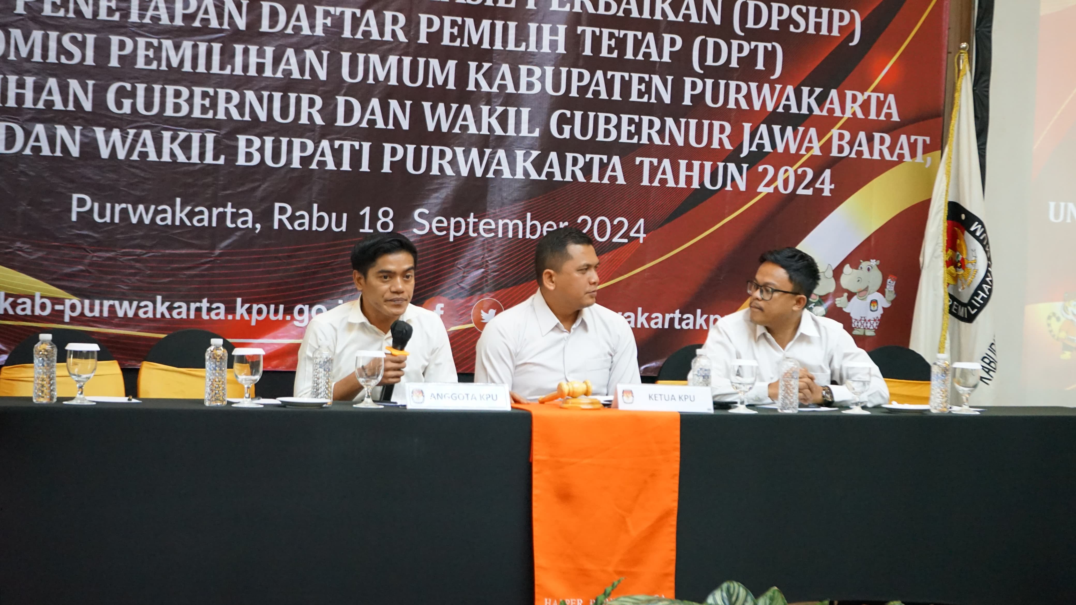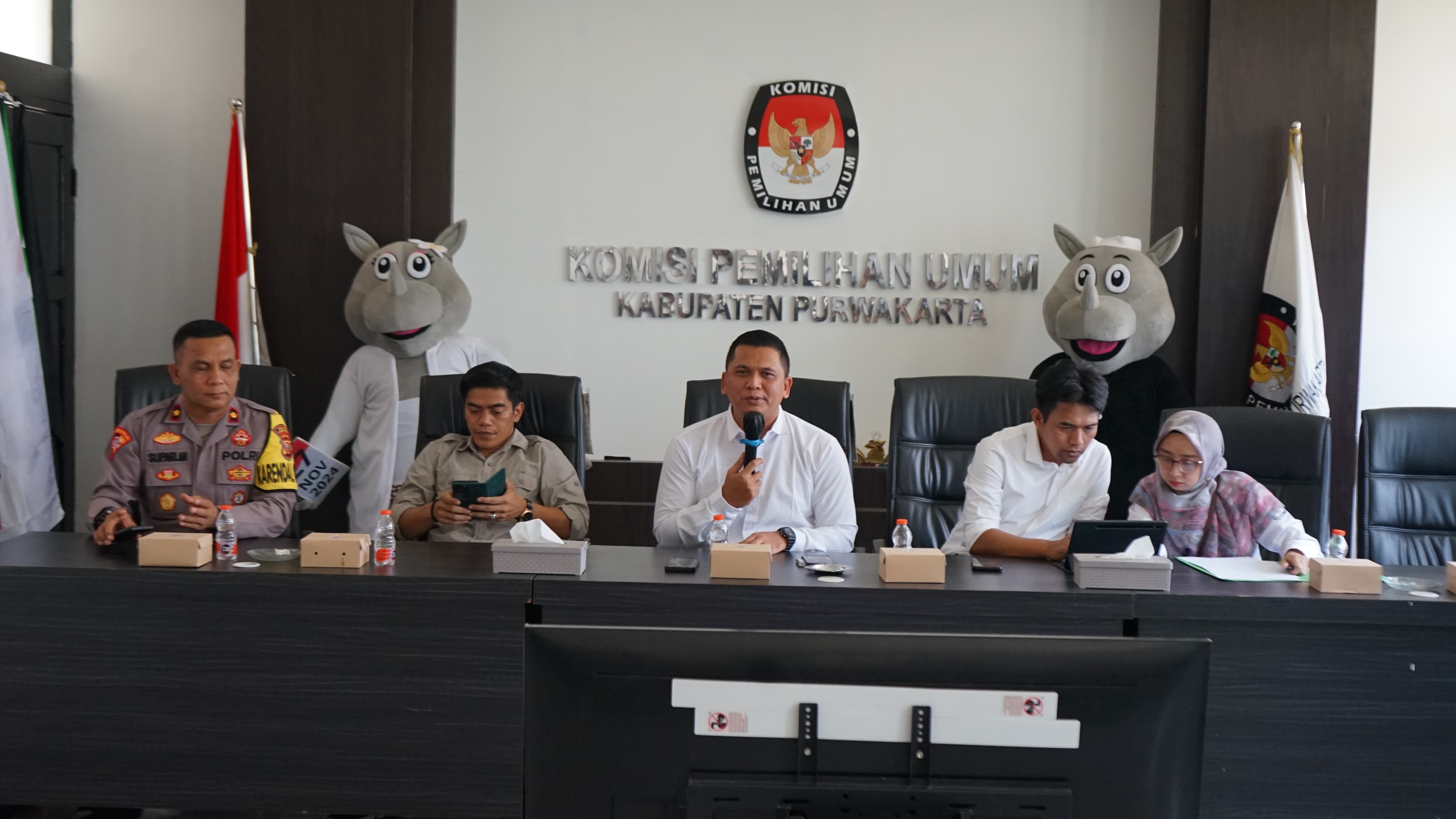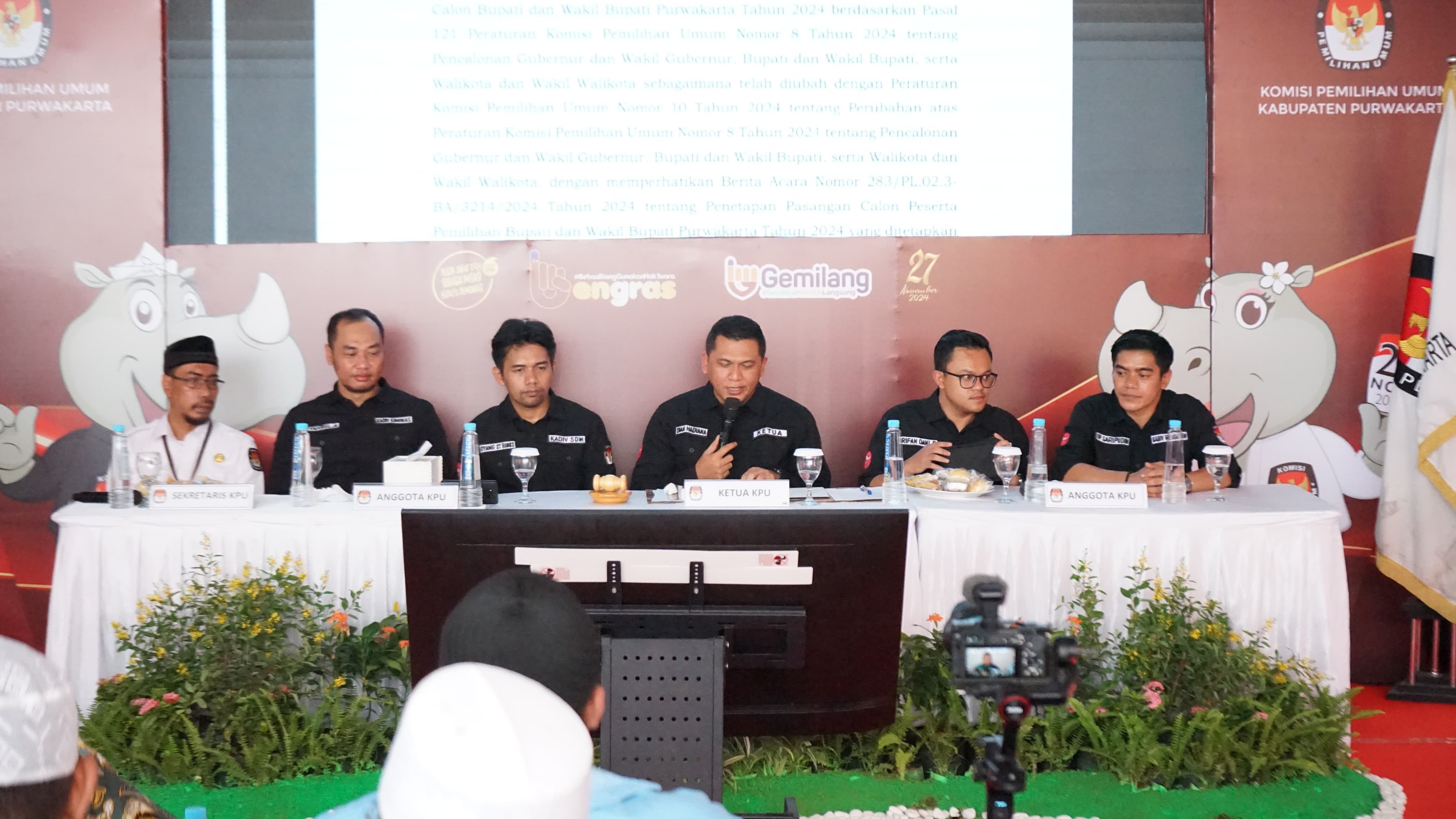 Purwakarta -- KPU Kabupaten Purwakarta menggelar Rapat Pleno Terbuka Pengundian dan Penetapan Nomor Urut Pasangan Calon Bupati dan Wakil Bupati Untuk Pilkada 2024. Rapat pleno tersebut berlangsung di Halaman Kantor KPU Kabupaten Purwakarta, Senin 24 September 2024. Ketua KPU Kabupaten Purwakarta Dian Hadiana mengatakan, rapat pleno ini merupakan tahapan penting dalam pelaksanaan pilkada. "Alhamdulilah pengundian dan penetapan nomor urut pasangan calon untuk Pilkada 2024 di Purwakarta sudah selesai," ujar Dian. Dia menyebut acara selanjutnya yakni deklarasi kampanye damai berlokasi di Taman Surawisesa Situbuleud sekira pukul 14.00 WIB."Mudah-mudahan acara kedua dihari ini juga berjalan lancar," kata Dian. Adapun nomor urut pasangan calon Pilkada 2024 yakni : 1. Saepul Bahri Binzen - Abang Ijo Hapidin 2. Yadi Rusmayadi - Pipin Sopian 3. Anne Ratna Mustika - Budi Hermawan 4. H. Zainal Arifin - H. Sona Maulida Roemardie