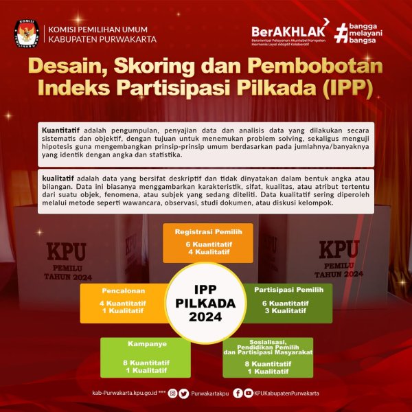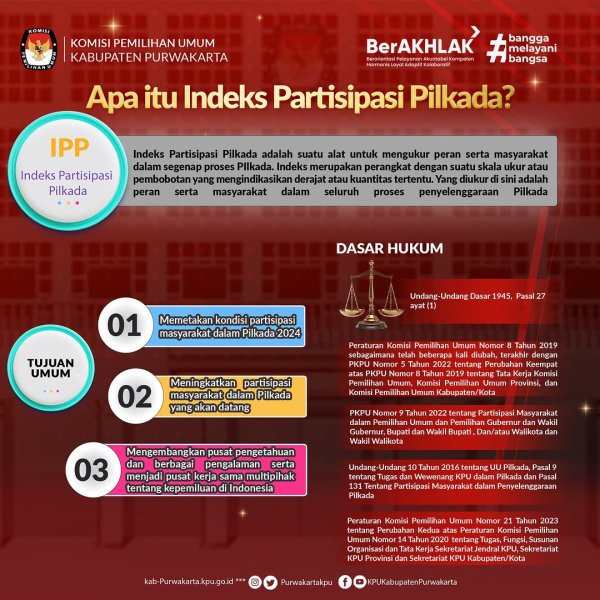 #TemanPemilih berikut informasi apa itu Indeks Partisipasi Pilkada? IPP merupakan alat ukur yang dikembangkan oleh KPU RI untuk menilai tingkat partisipasi masyarakat dalam seluruh tahapan pemilu maupun pilkada. Penilaian tidak hanya difokuskan pada tingkat kehadiran masyarakat saat hari pemungutan suara, namun juga mencakup berbagai aktivitas penting lainnya, seperti sosialisasi, pendidikan pemilih (sosdiklih), kampanye, hingga tahapan pencalonan dan registrasi pemilih.