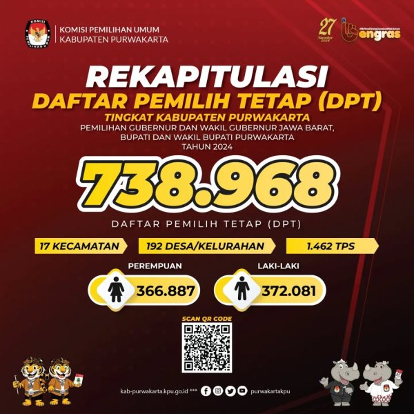 #TemanPemilih berikut Daftar Pemilih Tetap (DPT) tingkat Kabupaten Purwakarta Pemilihan Gubernur dan Wakil Gubernur Jawa Barat, Bupati dan Wakil Bupati Purwakarta Tahun 2024.