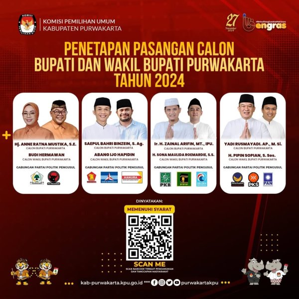 #TemanPemilih berikut Penetapan Pasangan Calon Bupati dan Wakil Bupati Purwakarta Tahun 2024, Scan Barcode yang ada di gambar atau Kunjungi Laman web KPU Kabupaten Purwakarta kab-purwakarta.kpu.go.id