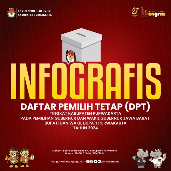 #TemanPemilih Infografis Daftar Pemilih Tetap (DPT) Tingkat Kabupaten Purwakarta pada pemilihan Gubernur dan Wakil Gubernur Jawa Barat serta Bupati dan Wakil Bupati Purwakarta Tahun 2024.