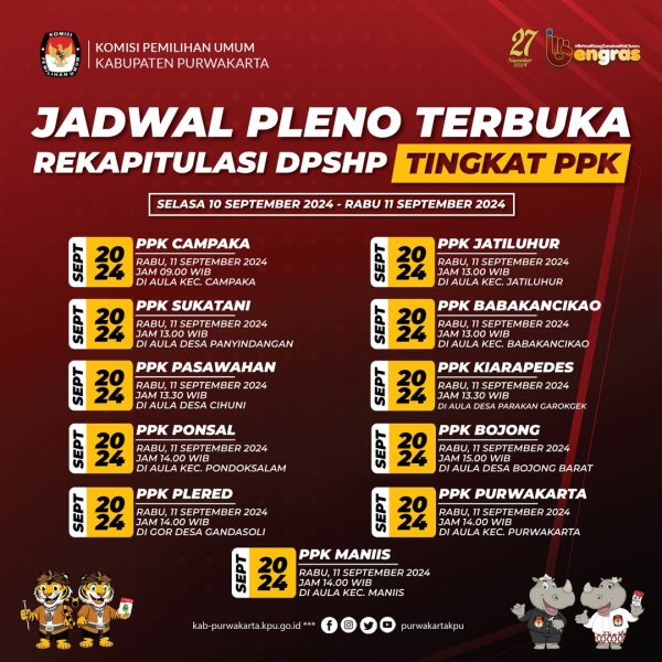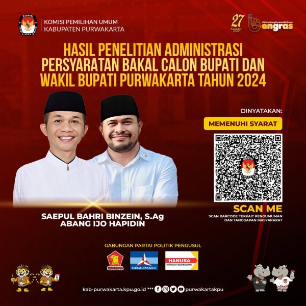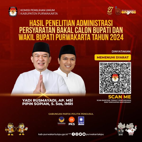 #TemanPemilih, berikut kami sampaikan Hasil Penelitian Administrasi persyaratan Bakal Calon Bupati dan Wakil Bupati Purwakarta Tahun 2024 pasangan calon Yadi Rusmayadi, AP, Msi - Pipin Sopian, S. Sos, IMRI.