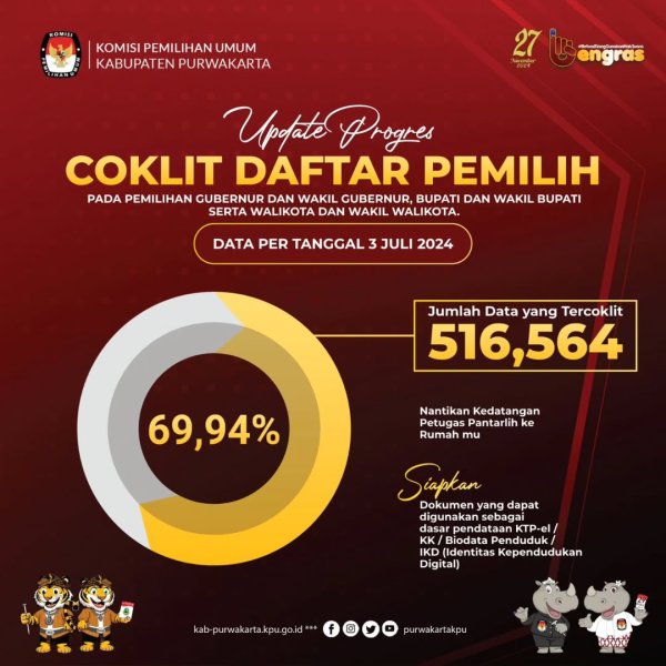#TemanPemilih berikut update Coklit Daftar Pemilih pada Pemilihan Gubernur dan Wakil Gubernur Jawa Barat, Bupati dan Wakil Bupati Purwakarta tahun 2024, Data pertanggal 3 Juli 2024.