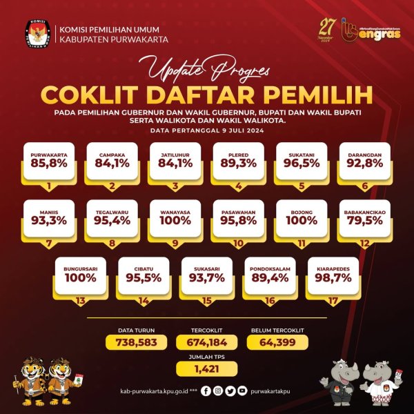 #TemanPemilih berikut update Coklit Daftar Pemilih setiap Kecamatan pada Pemilihan Gubernur dan Wakil Gubernur Jawa Barat, Bupati dan Wakil Bupati Purwakarta tahun 2024, Data pertanggal 9 Juli 2024.