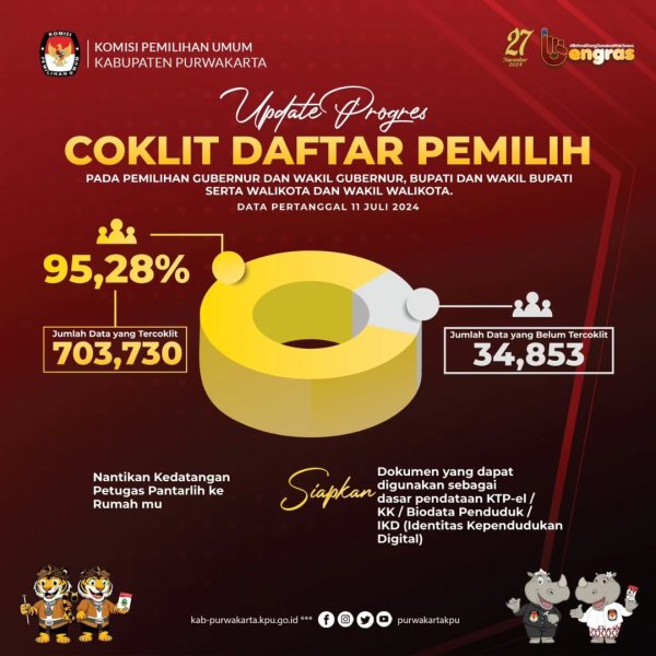 #TemanPemilih berikut update Coklit Daftar Pemilih pada Pemilihan Gubernur dan Wakil Gubernur Jawa Barat, Bupati dan Wakil Bupati Purwakarta tahun 2024, Data pertanggal 11 Juli 2024.