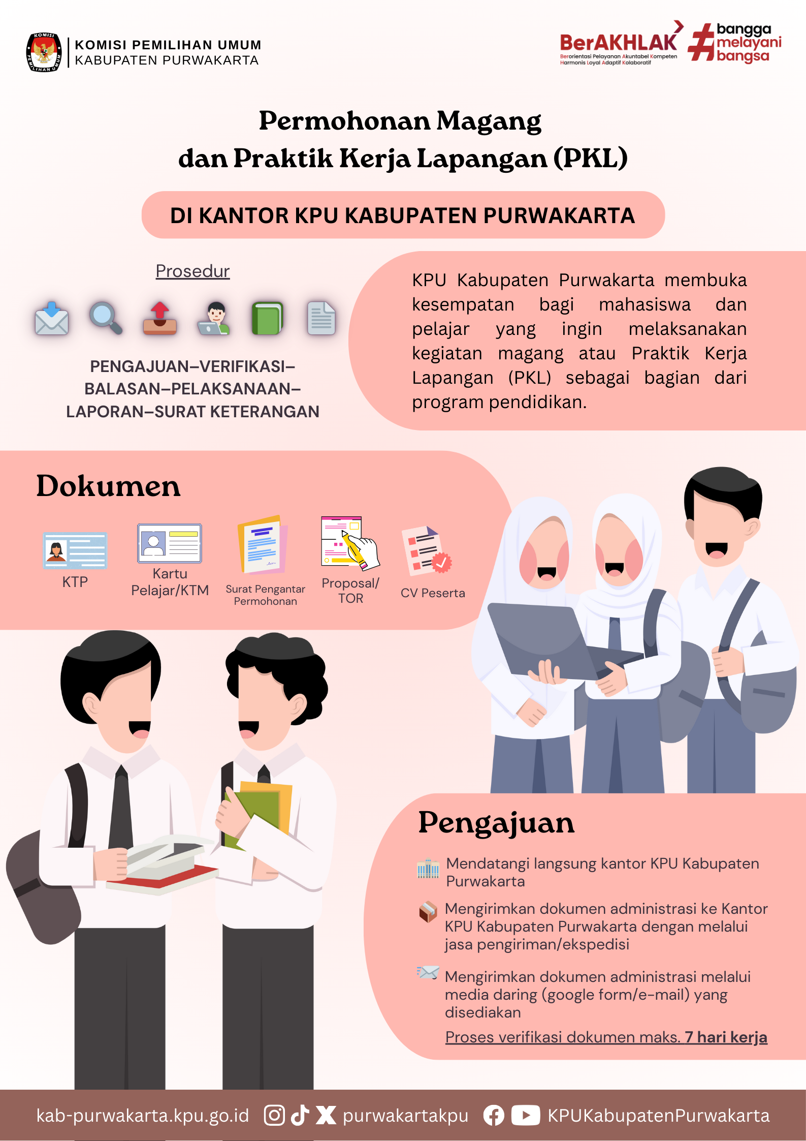 KPU Kabupaten Purwakarta membuka kesempatan bagi mahasiswa dan pelajar yang ingin melaksanakan kegiatan magang atau Praktik Kerja Lapangan (PKL) sebagai bagian dari program pendidikan.